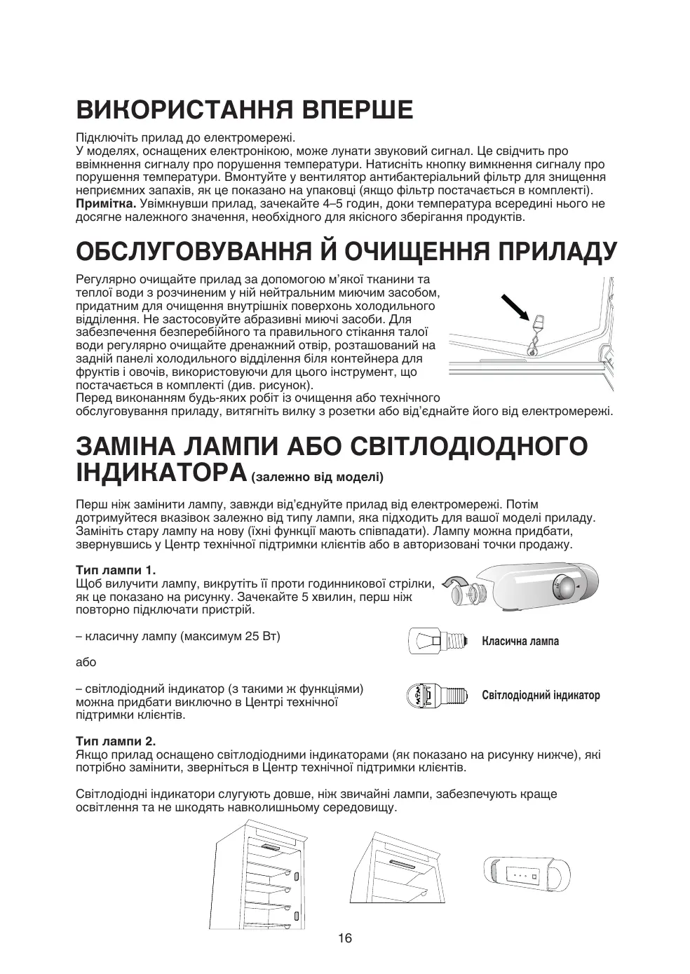 ВИКОРИСТАННЯ ВПЕРШЕ Підключіть прилад до електромережі. У моделях, оснащених електронікою, може лунати звуковий сигнал. Це свідчить про ввімкнення сигналу про порушення температури. Натисніть кнопку вимкнення сигналу про порушення температури. Вмонтуйте у вентилятор антибактеріальний фільтр для знищення неприємних запахів, як це показано на упаковці (якщо фільтр постачається в комплекті). Примітка. Увімкнувши прилад, зачекайте 4–5 годин, доки температура всередині нього не досягне належного значення, необхідного для якісного зберігання продуктів. ОБСЛУГОВУВАННЯ Й ОЧИЩЕННЯ ПРИЛАДУ Регулярно очищайте прилад за допомогою м’якої тканини та теплої води з розчиненим у ній нейтральним миючим засобом, придатним для очищення внутрішніх поверхонь холодильного відділення. Не застосовуйте абразивні миючі засоби. Для забезпечення безперебійного та правильного стікання талої води регулярно очищайте дренажний отвір, розташований на задній панелі холодильного відділення біля контейнера для фруктів і овочів, використовуючи для цього інструмент, що постачається в комплекті (див. рисунок). Перед виконанням будь-яких робіт із очищення або технічного обслуговування приладу, витягніть вилку з розетки або від’єднайте його від електромережі. Заміна лампи або світлодіодного індикатора (залежно від моделі) Перш ніж замінити лампу, завжди від’єднуйте прилад від електромережі. Потім дотримуйтеся вказівок залежно від типу лампи, яка підходить для вашої моделі приладу. Замініть стару лампу на нову (їхні функції мають співпадати). Лампу можна придбати, звернувшись у Центр технічної підтримки клієнтів або в авторизовані точки продажу. Тип лампи 1. Щоб вилучити лампу, викрутіть її проти годинникової стрілки, як це показано на рисунку. Зачекайте 5 хвилин, перш ніж повторно підключати пристрій. – класичну лампу (максимум 25 Вт) Класична лампа