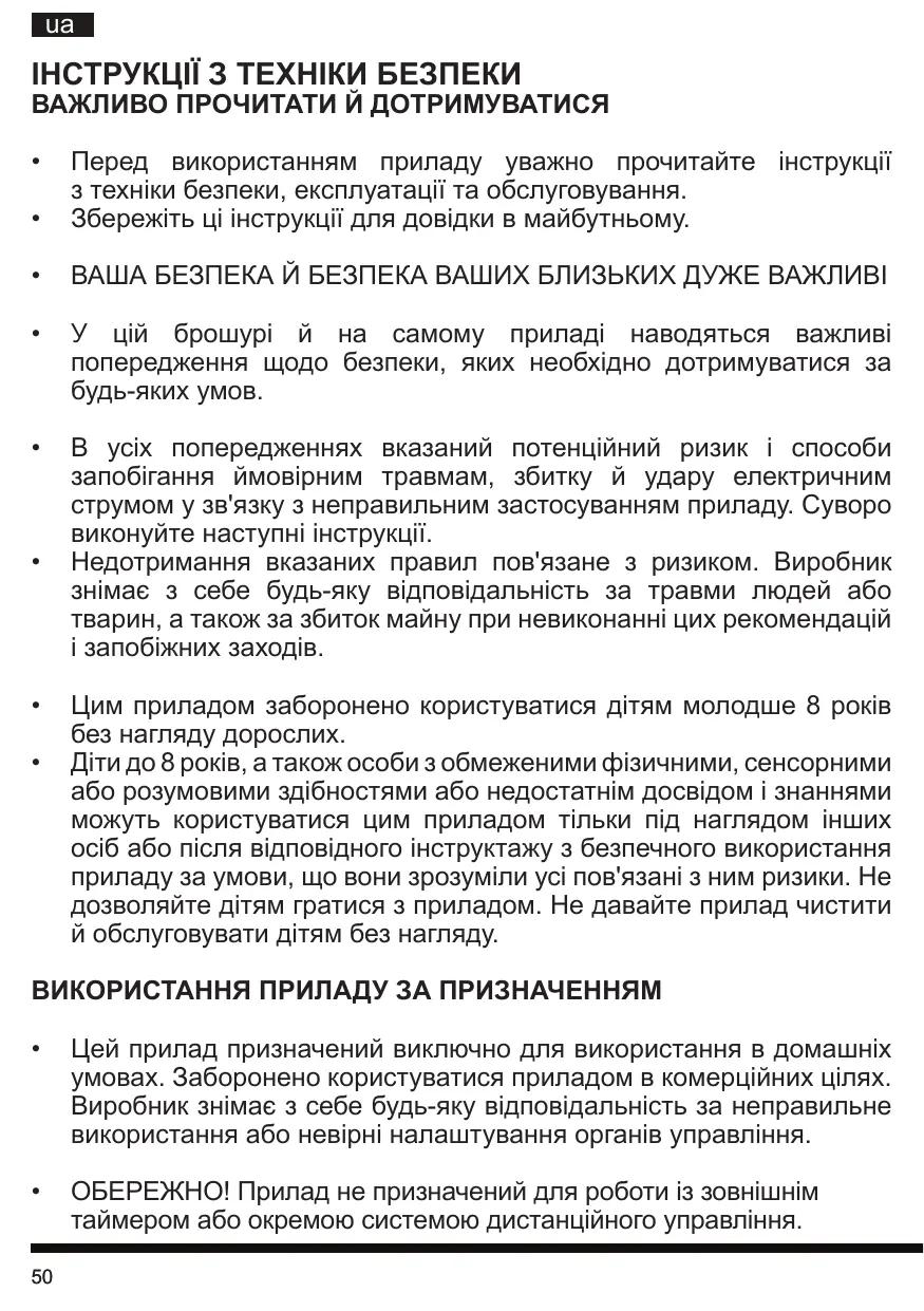 • ОБЕРЕЖНО! Прилад не призначений для роботи із зовнішнім таймером або окремою системою дистанційного управління. 50
