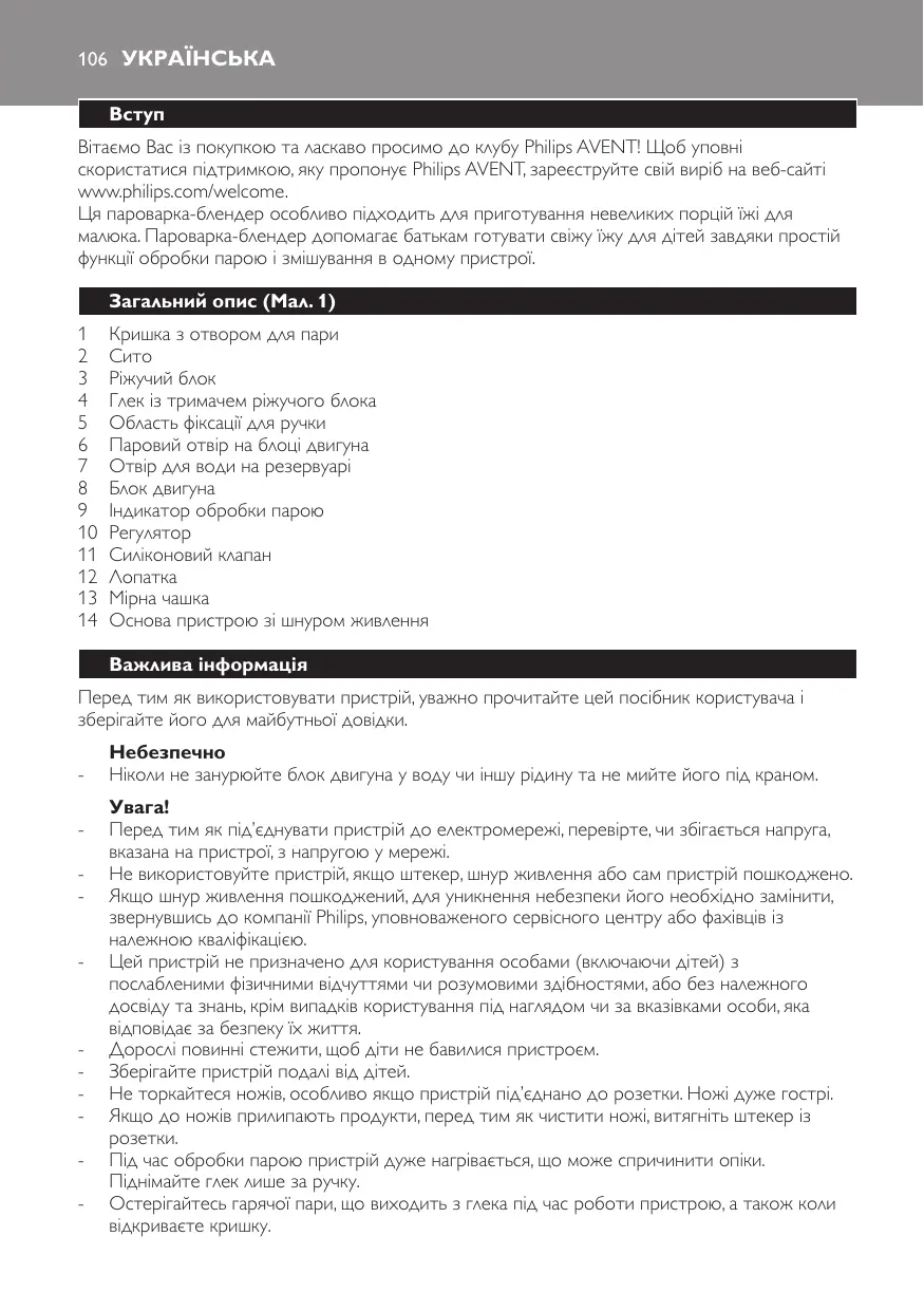 Кришка з отвором для пари Ріжучий блок Глек із тримачем ріжучого блока Область фіксації для ручки Паровий отвір на блоці двигуна Отвір для води на резервуарі Блок двигуна Індикатор обробки парою Силіконовий клапан Мірна чашка Основа пристрою зі шнуром живлення Важлива інформація Перед тим як використовувати пристрій, уважно прочитайте цей посібник користувача і зберігайте його для майбутньої довідки. -- Ніколи не занурюйте блок двигуна у воду чи іншу рідину та не мийте його під краном. -- Перед тим як під’єднувати пристрій до електромережі, перевірте, чи збігається напруга, вказана на пристрої, з напругою у мережі. -- Не використовуйте пристрій, якщо штекер, шнур живлення або сам пристрій пошкоджено. -- Якщо шнур живлення пошкоджений, для уникнення небезпеки його необхідно замінити, звернувшись до компанії Philips, уповноваженого сервісного центру або фахівців із належною кваліфікацією. -- Цей пристрій не призначено для користування особами (включаючи дітей) з послабленими фізичними відчуттями чи розумовими здібностями, або без належного досвіду та знань, крім випадків користування під наглядом чи за вказівками особи, яка відповідає за безпеку їх життя. -- Дорослі повинні стежити, щоб діти не бавилися пристроєм. -- Зберігайте пристрій подалі від дітей. -- Не торкайтеся ножів, особливо якщо пристрій під’єднано до розетки. Ножі дуже гострі. -- Якщо до ножів прилипають продукти, перед тим як чистити ножі, витягніть штекер із -- Під час обробки парою пристрій дуже нагрівається, що може спричинити опіки. Піднімайте глек лише за ручку. -- Остерігайтесь гарячої пари, що виходить з глека під час роботи пристрою, а також коли відкриваєте кришку. Українська 107 -- Не забувайте також про гарячу пару, що виходить з отвору для води на резервуарі, коли відкриваєте його кришку. -- Після обробки продуктів гаряча пара ще деякий час продовжує виходити із парового отвору на блоці двигуна та отвору для пари на кришці глека. Будьте уважні, коли знімаєте глек із блока двигуна. -- Якщо пристрій використовувати неналежним чином, з отвору для води може виходити гаряча пара. Для запобігання або усунення цієї проблеми див. розділ “Усунення несправностей”. -- Не залишайте пристрій працювати без нагляду. -- Не використовуйте насадки чи деталі інших виробників, за винятком тих, які рекомендує компанія Philips. Використання таких насадок чи деталей призведе до втрати гарантії. -- Не ставте пристрій на або біля увімкненої чи ще гарячої пічки або кухонної плити. -- Перед тим як встановлювати чи знімати будь-які частини пристрою, а також перед тим як чистити пристрій, завжди від’єднуйте його від мережі. -- Перед тим, як чистити пристрій, завжди від’єднуйте його від мережі і дайте охолонути. -- Ніколи не ставте глек або будь-які інші частини пристрою в мікрохвильову піч, оскільки металеві частини ручки глека і ріжучого блока не призначені для такого використання. -- Ніколи не стерилізуйте глек або будь-які інші частини пристрою в стерилізаторі чи мікрохвильовій печі, оскільки металеві частини ручки глека і ріжучого блока не призначені для такого використання. -- Цей пристрій призначений виключно для побутового використання. Якщо пристрій використовується неналежно, для (напів-)професійних чи інших цілей всупереч цій інструкції, гарантія втрачає чинність, а компанія Philips не несе в