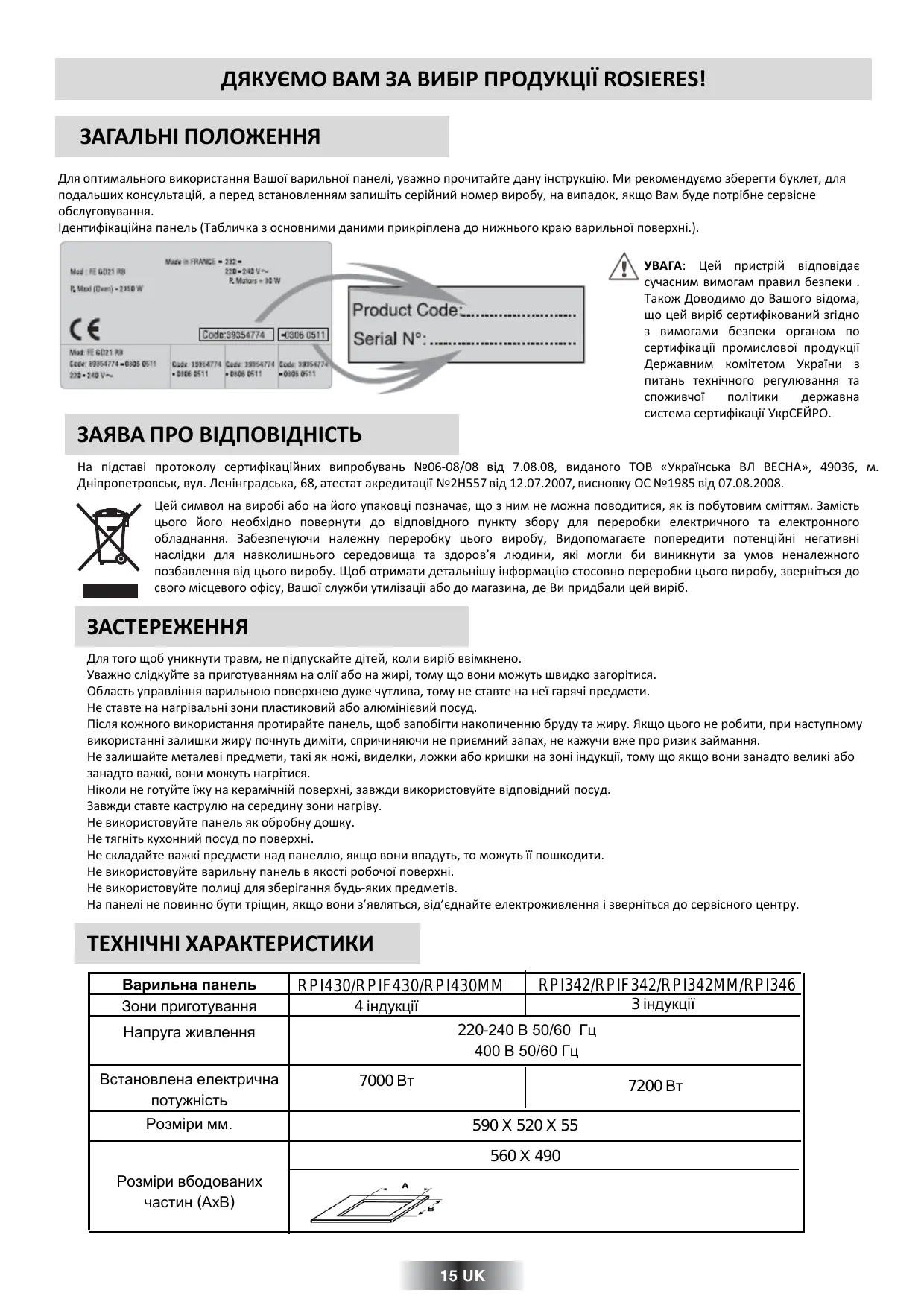 ПОСІБНИК КОРИСТУВАЧА RPI430 ROSIERES
