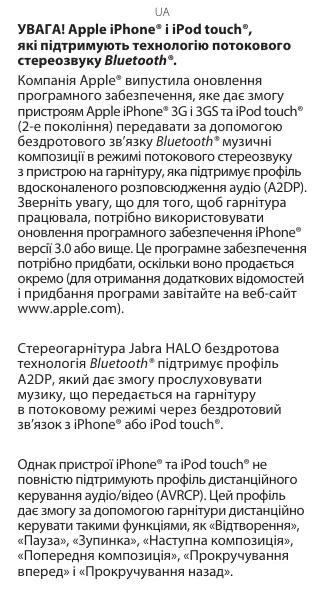 - La mise à jour logicielle Apple® 3.0 ne permet la prise en charge d'aucune fonctionnalité AVRCP de votre casque d'écoute Jabra HALO vers l'iPhone® ou l'iPod touch®. - La mise à jour logicielle Apple® 3.1 permet la prise en charge des fonctions Jouer, Pause et Arrêt. Aucune des fonctions Avancer, Reculer, Avance rapide et Recul rapide n'est prise en charge. Veuillez noter que vous pouvez toujours répondre et mettre fin aux appels (et régler le volume) directement de votre casque d'écoute Jabra si vous avez installé la mise à jour logicielle iPhone® 3.0 ou ultérieure sur votre iPhone® 3G ou 3GS ou iPod touch® (2e génération) d'Apple.