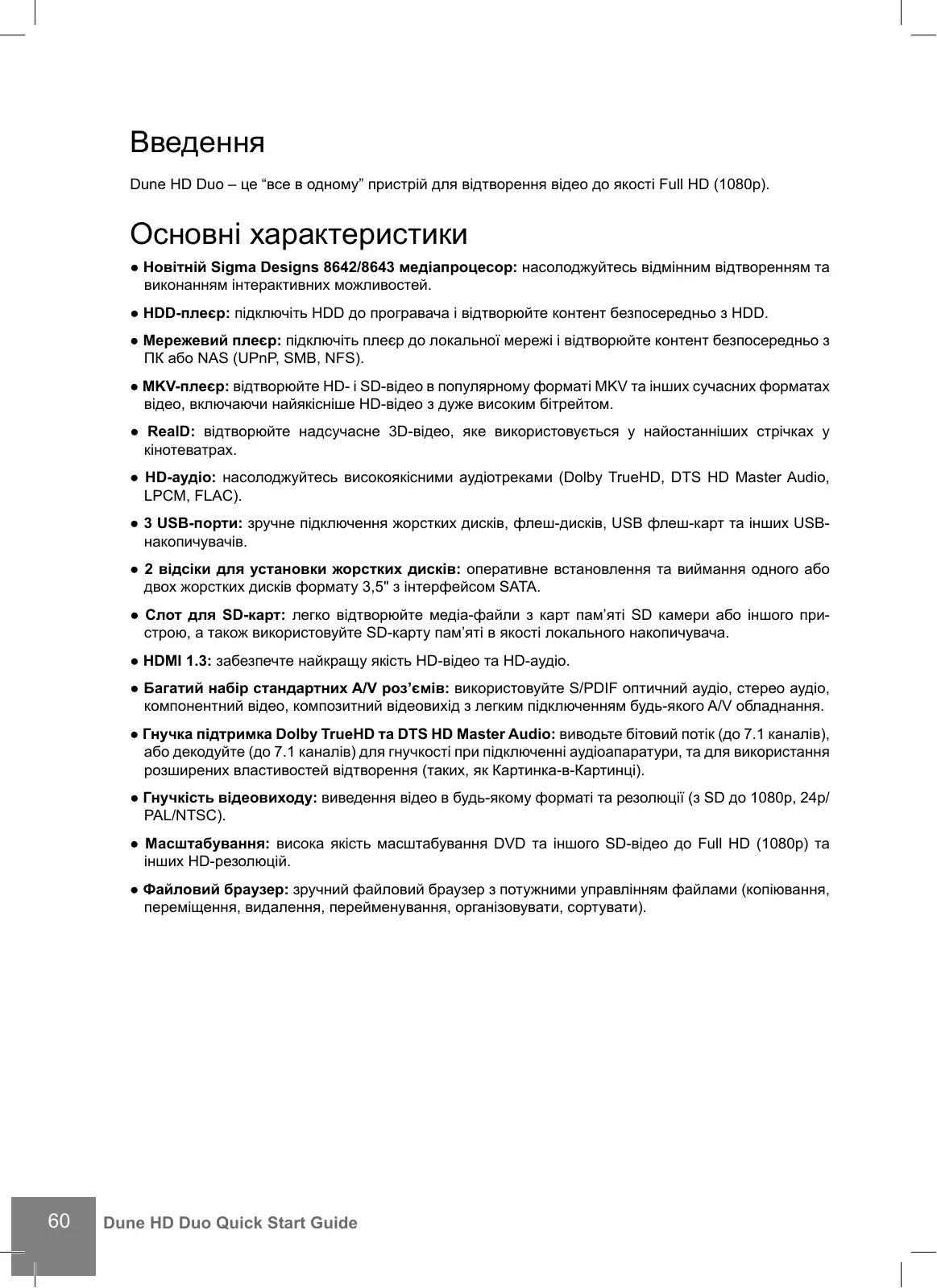 Dune HD Duo Quick Start Guide Додаткові функції ● Високоякісне відтворення музики: відтворюйте музичні файли дуже високої якості (до 192 кГц / 24 біт) в різних форматах (FLAC, Monkey’s Audio APE, WAV/PCM, DTS і т.д.). ● Плейлісти: створюйте плейлісти з Ваших папок, використовуйте свої власні плейлісти, використовуйте повторне відтворення і функцію перемішування. ● Функція NAS: доступ до файлів на пристроях зберігання (HDD, оптичний привід і т.д.), підключених до плеєра з локальної мережі (з використанням SMB і FTP). ● BitTorrent: використовуйте вбудований BitTorrent-клієнт для завантаження файлів з P2P-мереж. ● Можливість налаштовувати коритсувацький інтерфейс: робота з медіаколекціями з використанням обкладинок і значків перегляду (з Full HD графікою). ● Flash-програми: розширюйте функціональність прогровача з додатками FlashLite. ● Інтернет-радіо: відтворення і запис різних інтернет-радіостанцій (HTTP/MP3). ● IPTV: відтворення і запис IPTV-потоків (групові UDP/RTP) від Вашого Інтернет-провайдеру*. ● Оція цифрового телебачення: відтворення і запис цифрових телеканалів за допомогою додаткового цифрового TV USB-ключа **. ● Інтернет: перегляд Інтернет-сайтів на екрані телевізора за допомогою вбудованого Веббраузеру***.