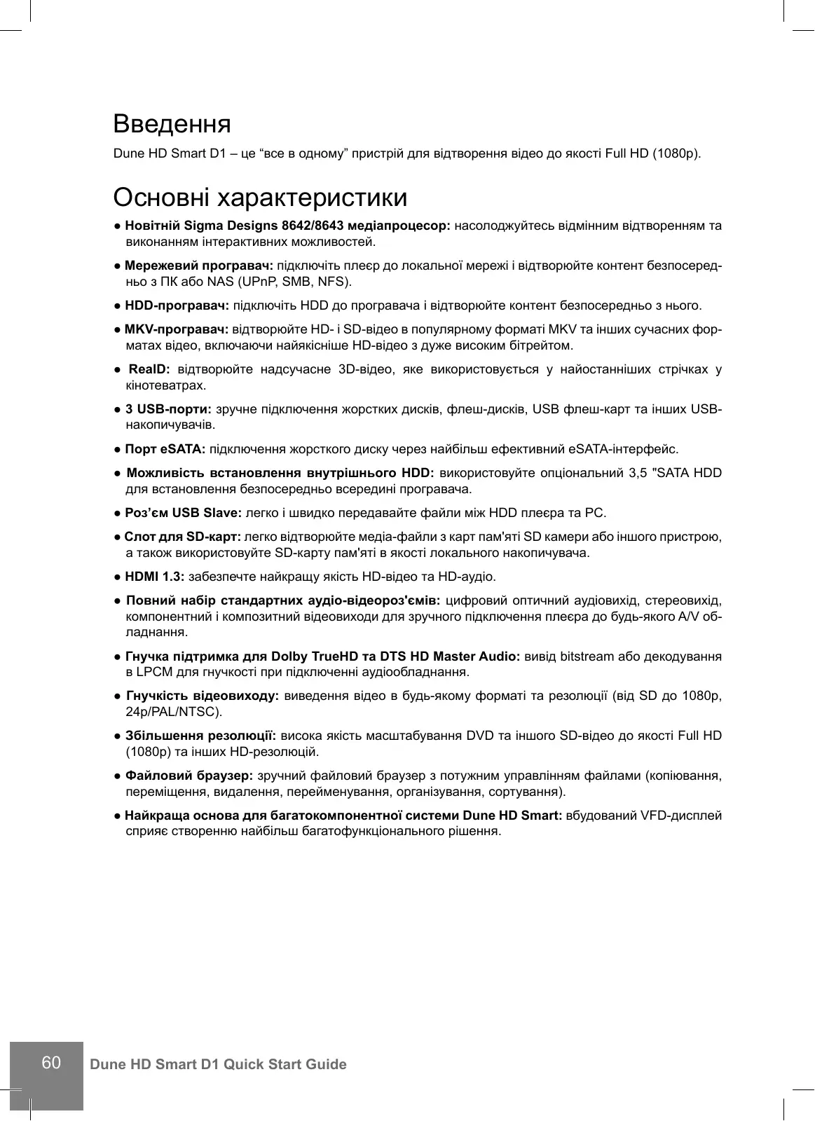 Dune HD Smart D1 – це “все в одному” пристрій для відтворення відео до якості Full HD (1080p). Основні характеристики ● Новітній Sigma Designs 8642/8643 медіапроцесор: насолоджуйтесь відмінним відтворенням та виконанням інтерактивних можливостей. ● Мережевий програвач: підключіть плеєр до локальної мережі і відтворюйте контент безпосередньо з ПК або NAS (UPnP, SMB, NFS). ● HDD-програвач: підключіть HDD до програвача і відтворюйте контент безпосередньо з нього. ● MKV-програвач: відтворюйте HD- і SD-відео в популярному форматі MKV та інших сучасних форматах відео, включаючи найякіcніше HD-відео з дуже високим бітрейтом. ● RealD: відтворюйте надсучасне 3D-відео, яке використовується у найостанніших стрічках у кінотеватрах. ● 3 USB-порти: зручне підключення жорстких дисків, флеш-дисків, USB флеш-карт та інших USBнакопичувачів. ● Порт eSATA: підключення жорсткого диску через найбільш ефективний eSATA-інтерфейс. ● Можливість встановлення внутрішнього HDD: використовуйте опціональний 3,5 "SATA HDD для встановлення безпосередньо всередині програвача. ● Роз’єм USB Slave: легко і швидко передавайте файли між HDD плеєра та PC. ● Cлот для SD-карт: легко відтворюйте медіа-файли з карт пам'яті SD камери або іншого пристрою, а також використовуйте SD-карту пам'яті в якості локального накопичувача. ● HDMI 1.3: забезпечте найкращу якість HD-відео та HD-аудіо. ● Повний набір стандартних аудіо-відеороз'ємів: цифровий оптичний аудіовихід, стереовихід, компонентний і композитний відеовиходи для зручного підключення плеєра до будь-якого A/V обладнання. ● Гнучка підтримка для Dolby TrueHD та DTS HD Master Audio: вивід bitstream або декодування в LPCM для гнучкості при підключенні аудіообладнання. ● Гнучкість відеовиходу: виведення відео в будь-якому форматі та резолюції (від SD до 1080p, 24p/PAL/NTSC). ● Збільшення резолюції: висока якість масштабування DVD та іншого SD-відео до якості Full HD (1080p) та інших HD-резолюцій. ● Файловий браузер: зручний файловий браузер з потужним управлінням файлами (копіювання, переміщення, видалення, перейменування, організування, сортування). ● Найкраща основа для багатокомпонентної системи Dune HD Smart: вбудований VFD-дисплей сприяє створенню найбільш багатофункціонального рішення.