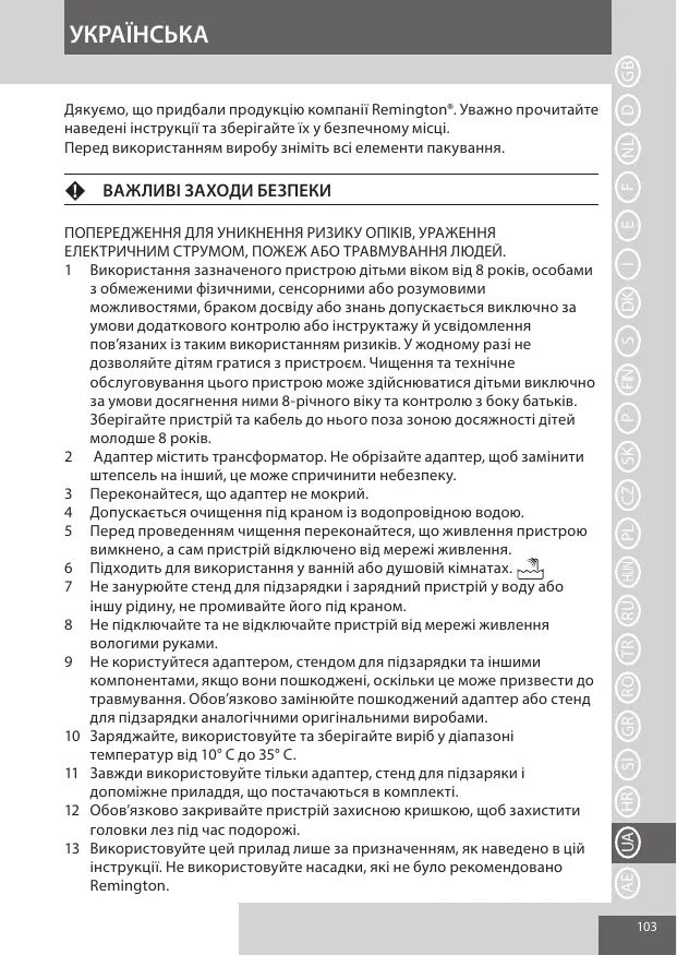 ПОПЕРЕДЖЕННЯ ДЛЯ УНИКНЕННЯ РИЗИКУ ОПІКІВ, УРАЖЕННЯ ЕЛЕКТРИЧНИМ СТРУМОМ, ПОЖЕЖ АБО ТРАВМУВАННЯ ЛЮДЕЙ. 1 Використання зазначеного пристрою дітьми віком від 8 років, особами з обмеженими фізичними, сенсорними або розумовими можливостями, браком досвіду або знань допускається виключно за умови додаткового контролю або інструктажу й усвідомлення пов’язаних із таким використанням ризиків. У жодному разі не дозволяйте дітям гратися з пристроєм. Чищення та технічне обслуговування цього пристрою може здійснюватися дітьми виключно за умови досягнення ними 8-річного віку та контролю з боку батьків. Зберігайте пристрій та кабель до нього поза зоною досяжності дітей молодше 8 років. 2 Адаптер містить трансформатор. Не обрізайте адаптер, щоб замінити штепсель на інший, це може спричинити небезпеку. 3 Переконайтеся, що адаптер не мокрий. 4 Допускається очищення під краном із водопровідною водою. 5 Перед проведенням чищення переконайтеся, що живлення пристрою вимкнено, а сам пристрій відключено від мережі живлення. 6 Підходить для використання у ванній або душовій кімнатах. 7 Не занурюйте стенд для підзарядки і зарядний пристрій у воду або іншу рідину, не промивайте його під краном. 8 Не підключайте та не відключайте пристрій від мережі живлення вологими руками. 9 Не користуйтеся адаптером, стендом для підзарядки та іншими компонентами, якщо вони пошкоджені, оскільки це може призвести до травмування. Обов’язково замінюйте пошкоджений адаптер або стенд для підзарядки аналогічними оригінальними виробами. 10 Заряджайте, використовуйте та зберігайте виріб у діапазоні температур від 10° C до 35° C. 11 Завжди використовуйте тільки адаптер, стенд для підзаряки і допоміжне приладдя, що постачаються в комплекті. 12 Обов’язково закривайте пристрій захисною кришкою, щоб захистити головки лез під час подорожі. 13 Використовуйте цей прилад лише за призначенням, як наведено в цій інструкції. Не використовуйте насадки, які не було рекомендовано Remington.