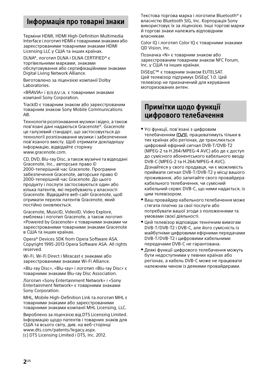 Макет карты следует извлекать из гнезда TV CAM (Модуль ограниченного доступа) только в том случае, если устанавливается смарт-карта, подходящая для разъема CAM. Наличие дополнительных принадлежностей зависит от стран/регионов/модели телевизора/запасов. Конструкция и технические характеристики могут быть изменены без предварительного уведомления. Інформація про товарні знаки Терміни HDMI, HDMI High-Definition Multimedia Interface і логотип HDMI є товарними знаками або зареєстрованими товарними знаками HDMI Licensing LLC у США та інших країнах. DLNA®, логотип DLNA і DLNA CERTIFIED® є торгівельними марками, знаками обслуговування або сертифікаційними знаками Digital Living Network Alliance. Виготовлено за ліцензією компанії Dolby Laboratories. Текстова торгова марка і логотипи Bluetooth® є власністю Bluetooth SIG, Inc. Корпорація Sony використовує їх за ліцензією. Інші торгові марки й торгові знаки належать відповідним Color IQ і логотип Color IQ є товарними знаками QD Vision, Inc. Позначка «N» є товарним знаком або зареєстрованим товарним знаком NFC Forum, Inc. у США та інших країнах. DiSEqC™ є товарним знаком EUTELSAT. Цей телевізор підтримує DiSEqC 1.0. Цей телевізор не призначений для керування моторизованих антен. «BRAVIA» і є товарними знаками компанії Sony Corporation. TrackID є товарним знаком або зареєстрованим товарним знаком Sony Mobile Communications AB. Технологія розпізнавання музики і відео, а також пов’язані дані надаються Gracenote®. Gracenote це галузевий стандарт, що застосовується до технології розпізнавання музики і забезпечення пов’язаного вмісту. Щоб отримати докладнішу інформацію, відвідайте сторінку www.gracenote.com. CD, DVD, Blu-ray Disc, а також музичні та відеодані Gracenote, Inc., авторське право © 2000-теперішній час Gracenote. Програмне забезпечення Gracenote, авторське право © 2000-теперішній час Gracenote. До цього продукту і послуги застосовуються один або кілька патентів, які перебувають у власності Gracenote. Відвідайте веб-сайт Gracenote, щоб отримати перелік патентів Gracenote, який постійно оновлюється. Gracenote, MusicID, VideoID, Video Explore, емблема і логотип Gracenote, а також логотип «Powered by Gracenote» є товарними знаками чи зареєстрованими товарними знаками Gracenote в США та інших країнах. Opera® Devices SDK from Opera Software ASA. Copyright 1995-2013 Opera Software ASA. All rights reserved. Wi-Fi, Wi-Fi Direct і Miracast є знаками або зареєстрованими знаками Wi-Fi Alliance. «Blu-ray Disc», «Blu-ray» і логотип «Blu-ray Disc» є товарними знаками Blu-ray Disc Association. Логотип «Sony Entertainment Network» і «Sony Entertainment Network» є товарними знаками Sony Corporation. MHL, Mobile High-Definition Link та логотип MHL є товарними знаками або зареєстрованими товарними знаками компанії MHL Licensing, LLC. Вироблено за ліцензією від DTS Licensing Limited. Інформацію щодо патентів і товарних знаків для США та всього світу, див. на веб-сторінці www.dts.com/patents/legacy.aspx. (c) DTS Licensing Limited і DTS, Inc. 2012. 2UA Примітки щодо функції цифрового телебачення Усі функції, пов’язані з цифровим телебаченням ( ), працюватимуть тільки в тих країнах або регіонах, де транслюється цифровий ефірний сигнал DVB-T/DVB-T2 (MPEG-2 та H.264/MPEG-4 AVC) або де є доступ до сумісного абонентського кабельного вводу DVB-C (MPEG-2 та H.264/MPEG-4 AVC). Дізнайтеся у свого продавця, чи є можливість приймати сигнал DVB-T/DVB-T2 у місці вашого проживання, або запитайте свого провайдера кабельного телебачення, чи сумісний кабельний сервіс DVB-C, що ними надається, із цим телевізором. Ваш провайдер кабельного телебачення може стягати платню за свої послуги або потребувати вашої згоди з положеннями та умовами своєї діяльності. Цей телевізор відповідає те