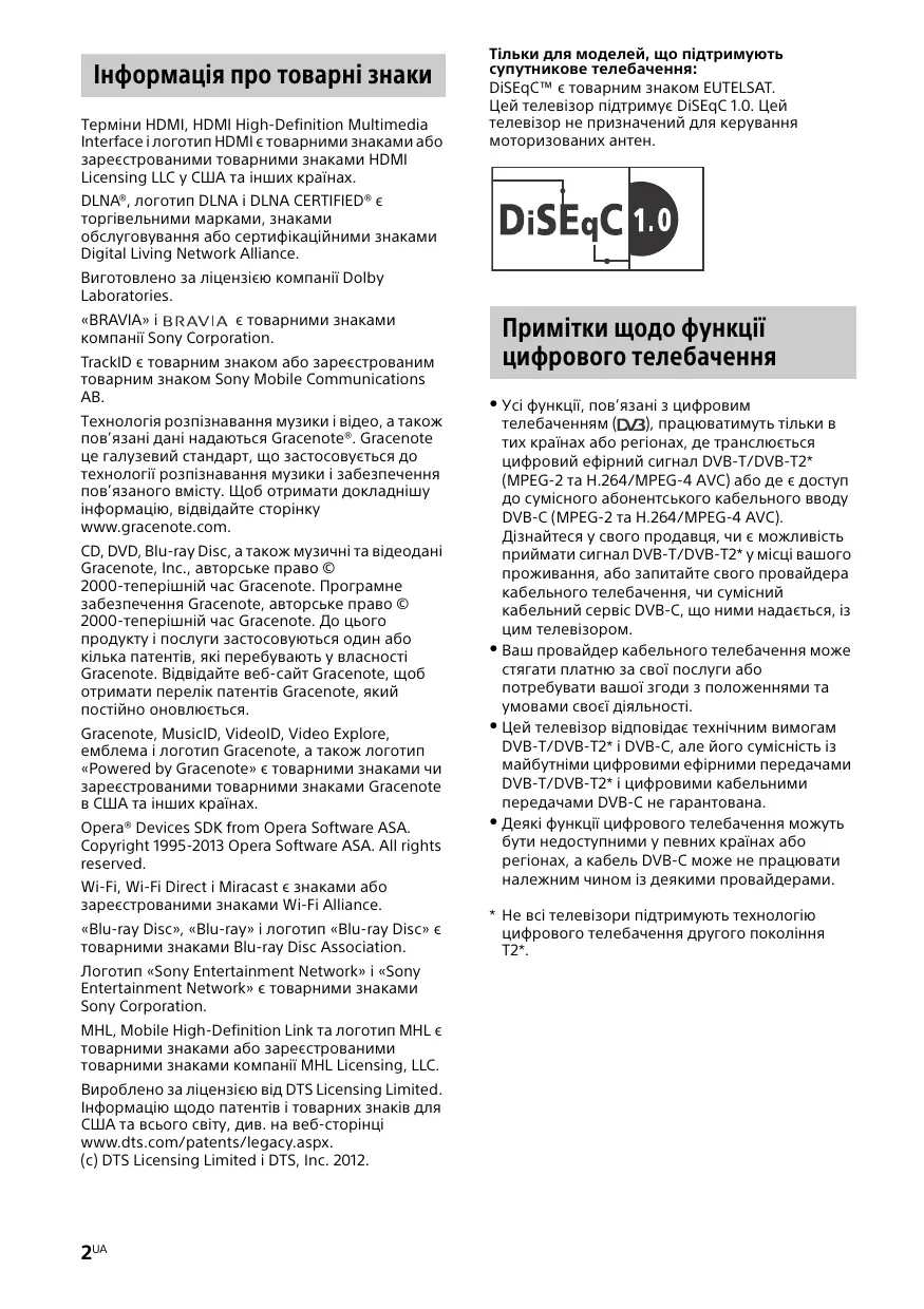 7RU Інформація про товарні знаки Терміни HDMI, HDMI High-Definition Multimedia Interface і логотип HDMI є товарними знаками або зареєстрованими товарними знаками HDMI Licensing LLC у США та інших країнах. Тільки для моделей, що підтримують супутникове телебачення: DiSEqC™ є товарним знаком EUTELSAT. Цей телевізор підтримує DiSEqC 1.0. Цей телевізор не призначений для керування моторизованих антен. DLNA®, логотип DLNA і DLNA CERTIFIED® є торгівельними марками, знаками обслуговування або сертифікаційними знаками Digital Living Network Alliance. Виготовлено за ліцензією компанії Dolby Laboratories. «BRAVIA» і є товарними знаками компанії Sony Corporation. TrackID є товарним знаком або зареєстрованим товарним знаком Sony Mobile Communications AB. Технологія розпізнавання музики і відео, а також пов’язані дані надаються Gracenote®. Gracenote це галузевий стандарт, що застосовується до технології розпізнавання музики і забезпечення пов’язаного вмісту. Щоб отримати докладнішу інформацію, відвідайте сторінку www.gracenote.com. CD, DVD, Blu-ray Disc, а також музичні та відеодані Gracenote, Inc., авторське право © 2000-теперішній час Gracenote. Програмне забезпечення Gracenote, авторське право © 2000-теперішній час Gracenote. До цього продукту і послуги застосовуються один або кілька патентів, які перебувають у власності Gracenote. Відвідайте веб-сайт Gracenote, щоб отримати перелік патентів Gracenote, який постійно оновлюється. Gracenote, MusicID, VideoID, Video Explore, емблема і логотип Gracenote, а також логотип «Powered by Gracenote» є товарними знаками чи зареєстрованими товарними знаками Gracenote в США та інших країнах. Opera® Devices SDK from Opera Software ASA. Copyright 1995-2013 Opera Software ASA. All rights reserved. Wi-Fi, Wi-Fi Direct і Miracast є знаками або зареєстрованими знаками Wi-Fi Alliance. «Blu-ray Disc», «Blu-ray» і логотип «Blu-ray Disc» є товарними знаками Blu-ray Disc Association. Логотип «Sony Entertainment Network» і «Sony Entertainment Network» є товарними знаками Sony Corporation. MHL, Mobile High-Definition Link та логотип MHL є товарними знаками або зареєстрованими товарними знаками компанії MHL Licensing, LLC. Вироблено за ліцензією від DTS Licensing Limited. Інформацію щодо патентів і товарних знаків для США та всього світу, див. на веб-сторінці www.dts.com/patents/legacy.aspx. (c) DTS Licensing Limited і DTS, Inc. 2012. 2UA Примітки щодо функції цифрового телебачення Усі функції, пов’язані з цифровим телебаченням ( ), працюватимуть тільки в тих країнах або регіонах, де транслюється цифровий ефірний сигнал DVB-T/DVB-T2* (MPEG-2 та H.264/MPEG-4 AVC) або де є доступ до сумісного абонентського кабельного вводу DVB-C (MPEG-2 та H.264/MPEG-4 AVC). Дізнайтеся у свого продавця, чи є можливість приймати сигнал DVB-T/DVB-T2* у місці вашого проживання, або запитайте свого провайдера кабельного телебачення, чи сумісний кабельний сервіс DVB-C, що ними надається, із цим телевізором. Ваш провайдер кабельного телебачення може стягати платню за свої послуги або потребувати вашої згоди з положеннями та умовами своєї діяльності. Цей телевізор відповідає технічним вимогам DVB-T/DVB-T2* і DVB-C, але його сумісність із майбутніми цифровими ефірними передачами DVB-T/DVB-T2* і цифровими кабельними передачами DVB-C не гарантована. Деякі функції цифрового телебачення можуть бути недоступними у певних країнах або регіонах, а кабель DVB-C може не працювати належним чином із деякими провайдерами.