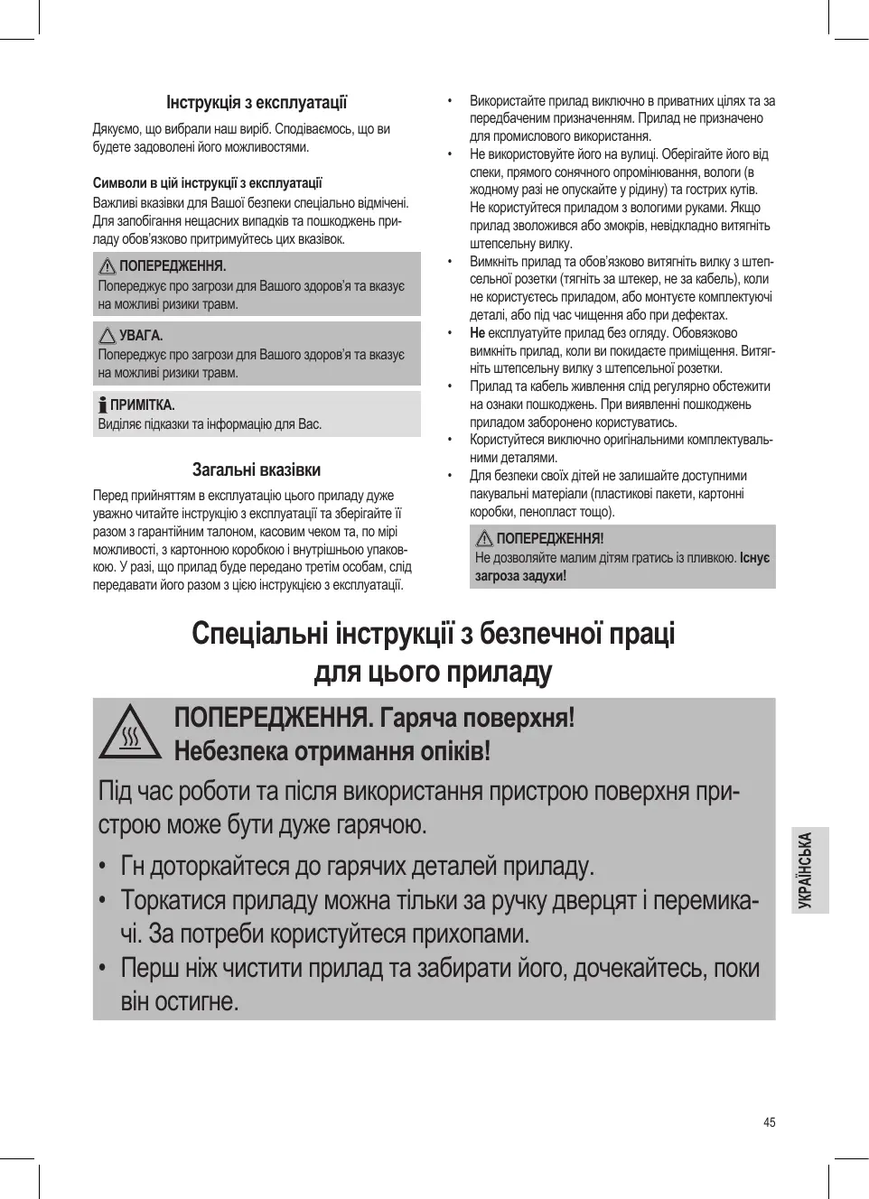 Використайте прилад виключно в приватних цілях та за передбаченим призначенням. Прилад не призначено для промислового використання. Не використовуйте його на вулиці. Оберігайте його від спеки, прямого сонячного опромінювання, вологи (в жодному разі не опускайте у рідину) та гострих кутів. Не користуйтеся приладом з вологими руками. Якщо прилад зволожився або змокрів, невідкладно витягніть штепсельну вилку. Вимкніть прилад та обов’язково витягніть вилку з штепсельної розетки (тягніть за штекер, не за кабель), коли не користуєтесь приладом, або монтуєте комплектуючі деталі, або під час чищення або при дефектах. Не експлуатуйте прилад без огляду. Обовязково вимкніть прилад, коли ви покидаєте приміщення. Витягніть штепсельну вилку з штепсельної розетки. Прилад та кабель живлення слід регулярно обстежити на ознаки пошкоджень. При виявленні пошкоджень приладом заборонено користуватись. Користуйтеся виключно оригінальними комплектувальними деталями. Для безпеки своїх дітей не залишайте доступними пакувальні матеріали (пластикові пакети, картонні коробки, пенопласт тощо). ПОПЕРЕДЖЕННЯ! Не дозволяйте малим дітям гратись із пливкою. Існує загроза задухи! Спеціальні інструкції з безпечної праці для цього приладу ПОПЕРЕДЖЕННЯ. Гаряча поверхня! Небезпека отримання опіків! Під час роботи та після використання пристрою поверхня пристрою може бути дуже гарячою.