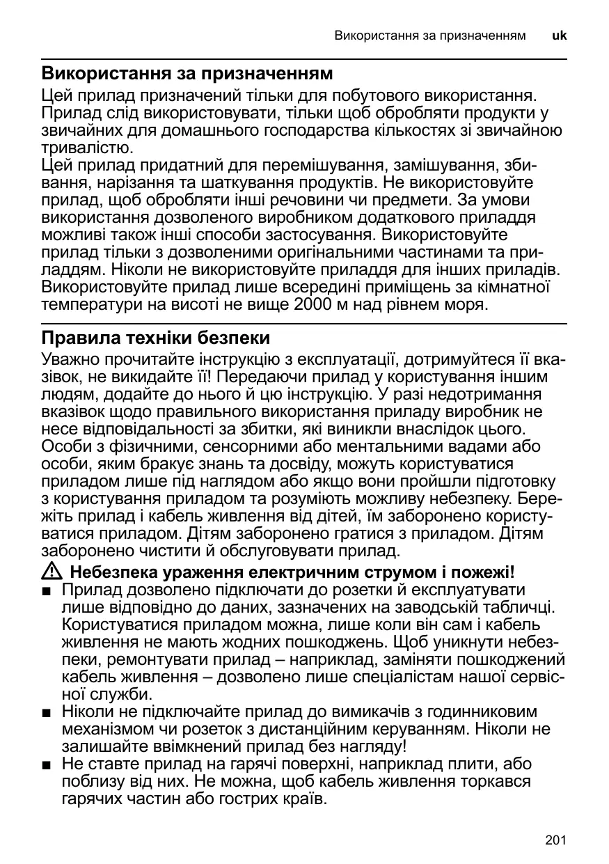 Використання за призначенням Цей прилад призначений тільки для побутового використання. Прилад слід використовувати, тільки щоб обробляти продукти у звичайних для домашнього господарства кількостях зі звичайною тривалістю. Цей прилад придатний для перемішування, замішування, збивання, нарізання та шаткування продуктів. Не використовуйте прилад, щоб обробляти інші речовини чи предмети. За умови використання дозволеного виробником додаткового приладдя можливі також інші способи застосування. Використовуйте прилад тільки з дозволеними оригінальними частинами та приладдям. Ніколи не використовуйте приладдя для інших приладів. Використовуйте прилад лише всередині приміщень за кімнатної температури на висоті не вище 2000 м над рівнем моря. Правила техніки безпеки Уважно прочитайте інструкцію з експлуатації, дотримуйтеся її вказівок, не викидайте її! Передаючи прилад у користування іншим людям, додайте до нього й цю інструкцію. У разі недотримання вказівок щодо правильного використання приладу виробник не несе відповідальності за збитки, які виникли внаслідок цього. Особи з фізичними, сенсорними або ментальними вадами або особи, яким бракує знань та досвіду, можуть користуватися приладом лише під наглядом або якщо вони пройшли підготовку з користування приладом та розуміють можливу небезпеку. Бережіть прилад і кабель живлення від дітей, їм заборонено користуватися приладом. Дітям заборонено гратися з приладом. Дітям заборонено чистити й обслуговувати прилад. W Небезпека ураження електричним струмом і пожежі! ■ Прилад дозволено підключати до розетки й експлуатувати лише відповідно до даних, зазначених на заводській табличці. Користуватися приладом можна, лише коли він сам і кабель живлення не мають жодних пошкоджень. Щоб уникнути небезпеки, ремонтувати прилад – наприклад, заміняти пошкоджений кабель живлення – дозволено лише спеціалістам нашої сервісної служби. ■ Ніколи не підключайте прилад до вимикачів з годинниковим механізмом чи розеток з дистанційним керуванням. Ніколи не залишайте ввімкнений прилад без нагляду! ■ Не ставте прилад на гарячі поверхні, наприклад плити, або поблизу від них. Не можна, щоб кабель живлення торкався гарячих частин або гострих країв.
