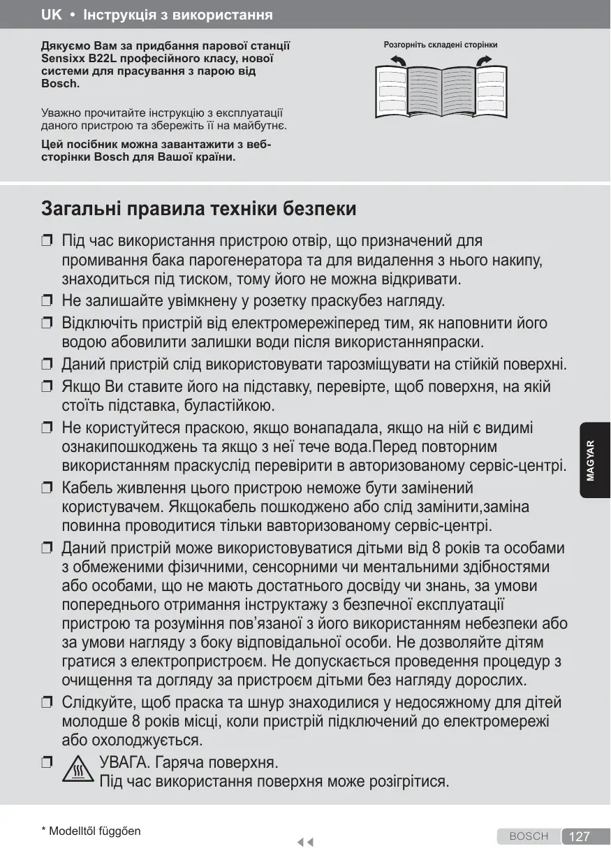 ❐❐ Під час використання пристрою отвір, що призначений для промивання бака парогенератора та для видалення з нього накипу, знаходиться під тиском, тому його не можна відкривати. ❐❐ Не залишайте увімкнену у розетку праскубез нагляду. ❐❐ Відключіть пристрій від електромережіперед тим, як наповнити його водою абовилити залишки води після використанняпраски. ❐❐ Даний пристрій слід використовувати тарозміщувати на стійкій поверхні. ❐❐ Якщо Ви ставите його на підставку, перевірте, щоб поверхня, на якій стоїть підставка, буластійкою. ❐❐ Не користуйтеся праскою, якщо вонападала, якщо на ній є видимі ознакипошкоджень та якщо з неї тече вода.Перед повторним використанням праскуслід перевірити в авторизованому сервіс-центрі. ❐❐ Кабель живлення цього пристрою неможе бути замінений користувачем. Якщокабель пошкоджено або слід замінити,заміна повинна проводитися тільки вавторизованому сервіс-центрі. ❐❐ Даний пристрій може використовуватися дітьми від 8 років та особами з обмеженими фізичними, сенсорними чи ментальними здібностями або особами, що не мають достатнього досвіду чи знань, за умови попереднього отримання інструктажу з безпечної експлуатації пристрою та розуміння пов’язаної з його використанням небезпеки або за умови нагляду з боку відповідальної особи. Не дозволяйте дітям гратися з електропристроєм. Не допускається проведення процедур з очищення та догляду за пристроєм дітьми без нагляду дорослих. ❐❐ Слідкуйте, щоб праска та шнур знаходилися у недосяжному для дітей молодше 8 років місці, коли пристрій підключений до електромережі або охолоджується. ❐❐ УВАГА. Гаряча поверхня. Під час використання поверхня може розігрітися. * Modelltől függően
