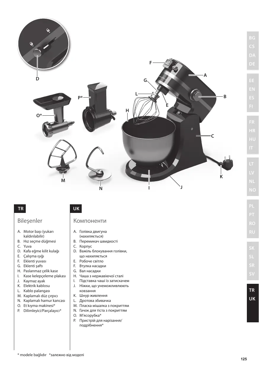 A. Голівка двигуна (нахиляється) B. Перемикач швидкості C. Корпус D. Важіль блокування голівки, що нахиляється E. Робоче світло F. Втулка насадки G. Вал насадки H. Чаша з нержавіючої сталі I. Підставка чаші із затискачем J. Ніжки, що унеможливлюють ковзання K. Шнур живлення L. Дротова збивачка M. Пласка мішалка з покриттям N. Гачок для тіста з покриттям O. М’ясорубка* P. Пристрій для нарізання/ подрібнення*