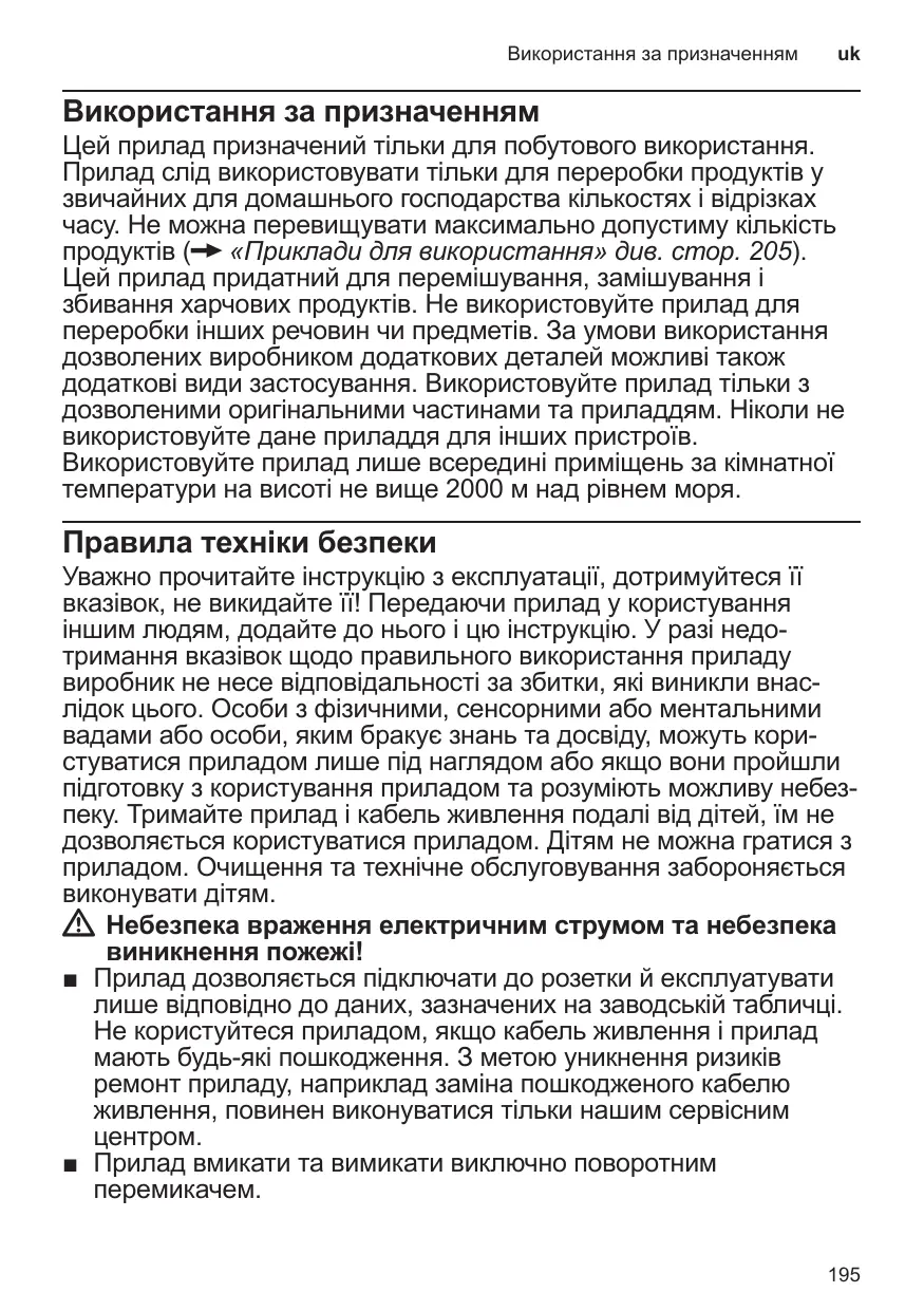Використання за призначенням Цей прилад призначений тільки для побутового використання. Прилад слід використовувати тільки для переробки продуктів у звичайних для домашнього господарства кількостях і відрізках часу. Не можна перевищувати максимально допустиму кількість продуктів (X «Приклади для використання» див. стор. 205). Цей прилад придатний для перемішування, замішування і збивання харчових продуктів. Не використовуйте прилад для переробки інших речовин чи предметів. За умови використання дозволених виробником додаткових деталей можливі також додаткові види застосування. Використовуйте прилад тільки з дозволеними оригінальними частинами та приладдям. Ніколи не використовуйте дане приладдя для інших пристроїв. Використовуйте прилад лише всередині приміщень за кімнатної температури на висоті не вище 2000 м над рівнем моря. Правила техніки безпеки Уважно прочитайте інструкцію з експлуатації, дотримуйтеся її вказівок, не викидайте її! Передаючи прилад у користування іншим людям, додайте до нього і цю інструкцію. У разі недо тримання вказівок щодо правильного використання приладу виробник не несе відповідальності за збитки, які виникли внас лідок цього. Особи з фізичними, сенсорними або ментальними вадами або особи, яким бракує знань та досвіду, можуть кори стуватися приладом лише під наглядом або якщо вони пройшли підготовку з користування приладом та розуміють можливу небез пеку. Тримайте прилад і кабель живлення подалі від дітей, їм не дозволяється користуватися приладом. Дітям не можна гратися з приладом. Очищення та технічне обслуговування забороняється виконувати дітям. WW Небезпека враження електричним струмом та небезпека виникнення пожежі! ■■ Прилад дозволяється підключати до розетки й експлуатувати лише відповідно до даних, зазначених на заводській табличці. Не користуйтеся приладом, якщо кабель живлення і прилад мають будь-які пошкодження. З метою уникнення ризиків ремонт приладу, наприклад заміна пошкодженого кабелю живлення, повинен виконуватися тільки нашим сервісним ■■ Прилад вмикати та вимикати виключно поворотним перемикачем.