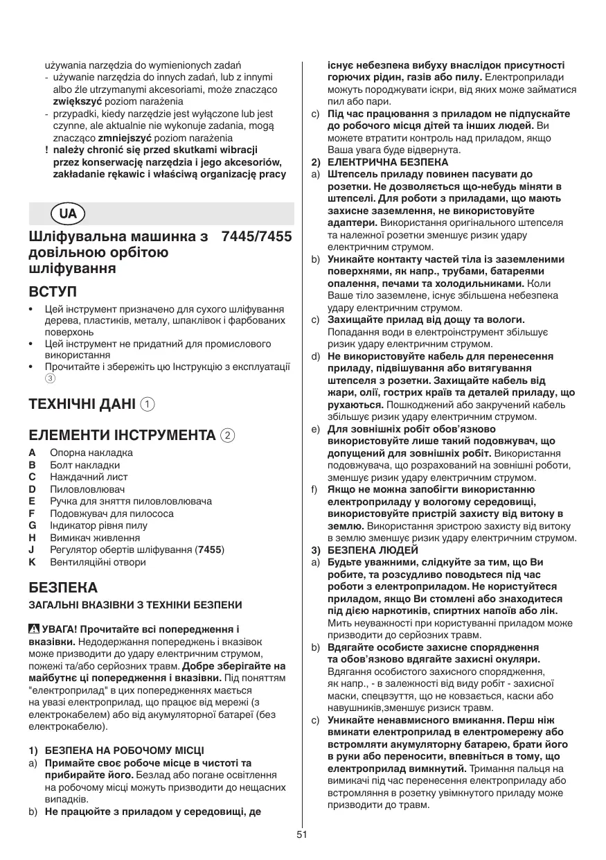 SEGURIDAD DE PERSONAS Esté atento y emplee la herramienta con prudencia. No utilice la herramienta eléctrica si estuviese cansado, ni bajo los efectos de alcohol, drogas o medicamentos. El no estar atento durante el uso de una herramienta eléctrica puede provocarle serias lesiones. Utilice un equipo de protección personal y en todo caso unas gafas de protección. El riesgo a lesionarse se reduce considerablemente si, dependiendo del tipo y la aplicación de la herramienta eléctrica empleada, se utiliza un equipo de protección adecuado como una mascarilla antipolvo, zapatos de seguridad con suela antideslizante, casco, o protectores auditivos. Evite una puesta en marcha fortuita. Asegurarse de que la herramienta eléctrica esté desconectada antes de conectarla a la toma de corriente y/o al montar el acumulador, al recogerla, y al transportarla. Si transporta la herramienta eléctrica sujetándola por el interruptor de conexión/desconexión, o si introduce el enchufe en la toma de corriente con la herramienta eléctrica conectada, ello puede dar lugar a un accidente. Retire las herramientas de ajuste o llaves fijas antes de conectar la herramienta eléctrica. Una herramienta o llave colocada en una pieza rotativa puede producir lesiones graves al accionar la herramienta eléctrica. Sea precavido. Trabaje sobre una base firme y mantenga el equilibrio en todo momento. Ello le permitirá controlar mejor la herramienta eléctrica en caso de presentarse una situación inesperada. Lleve puesta una vestimenta de trabajo adecuada. No utilice vestimenta amplia ni joyas. Mantenga su • El polvo del material, como por ejemplo la pintura que contiene plomo, algunas especies de madera, minerales y metal podrían ser dañinos (el contacto o inhalación del polvo podría producir reacciones alérgicas y/o transtornos respiratorios al operador u otras personas cerca); utilice una máscara contra el polvo y trabaje con un dispositivo de extracción de polvo cuando lo conecte • Ciertos tipos de polvo están catalogados como cancerígenos (por ejemplo el polvo de roble y de haya) especialmente junto con aditivos para el acondicionamiento de la madera; utilice una máscara contra el polvo y trabaje con un dispositivo de extracción de polvo cuando lo conecte • Siga la normativa nacional en cuanto a extracción de polvo, en función de los materiales que vayan a ser utilizados • Llevar guantes protectores, gafas de protección, vestimenta ceñida al cuerpo y protección adecuada para pelo largo • Asegure la pieza de trabajo (una pieza de trabajo fijada con unos dispositivos de sujeción o en un tornillo de banco, se mantiene sujeta de forma mucho más segura que con la mano) • Al lijar metal se generen chispas; no utilizar la caja de polvo y mantenga otras personas y materiales combustibles alejados de la zona de trabajo DURANTE EL USO • Mantenga siempre el cable lejos de las partes móviles de la herramienta; mantenga el cable detrás de usted, lejos de la herramienta • Evitar el contacto con el disco de lijado en marcha • En el caso de que se produjera un mal funcionamiento eléctrico o mecánico, apague inmediatamente la herramienta y desconecte el enchufe • Si llega a dañarse o cortarse el cable eléctrico durante el trabajo, no tocar el cable, sino extraer inmediatamente el enchufe de la red DESPUÉS DEL USO • Ponga atención al guardar su herramienta de que el motór está apagado y las partes móviles están parados -- monte la hoja de lijado VELCRO C de la forma ilustrada -- si es necesario, limpie primero el disco de apoyo !! las perforaciones de las hojas de lija deben corresponderse con las perforaciones de la lijadora !! la succión de polvo requiere que se usen hojas de lija perforadas !! cambie a tiempo las hojas de lija pasadas Aspiración de polvo 5 -- vacíe la caja de polvo D con regularidad para una aspiración optimal del polvo Para utilizar el aspirador -- retire la caja de polvo D pulsando el botón E hacia la izquierda y manteniéndolo en esa posición mientras tira la caja de polvo D hacia atrás -- monte el aspirador a la extensión F !! no utilice la caja de polvo/el aspirador al lijar metal Indicador del nivel de polvo 6 -- vacíe la caja de polvo D cuando el indicador G se vuelve ROJO -- el indicador G sólo funciona cuando la herramienta está encendida -- tenga presente que el funcionamiento del indicador de nivel de polvo no está garantizado cuando se lija con ajustes de velocidad bajos (7455) Interruptor On/Off -- ponga en marcha/pare su herramienta apretando el interruptor H 2 hacia adelante/atras !! antes de trabajar sobre una pieza, se debe poner en marcha su herramienta !! tenga cuidado con la reacción súbita de la herramienta, al conectarla !! antes de desactivar la herramienta, debe retirarla de la pieza de trabajo Control de velocidad 7 (7455) Para resultados optimos en diferentes materiales -- con la rueda J 2 se puede lograr la velocidad de lijado deseada -- ajustar siempre la velocidad según el grano de lija -- antes de empezar el trabajo, compruebe la velocidad y grano favorable con los materiales restante desperdiciados Sujección y manejo de la herramienta 8 !! durante el trabajo, sujete siempre la herramienta por la(s) zona(s) de empuñadura de color gris -- guie su herramienta paralelamente a la superficie de trabajo y muevala en circulos o en forma de cruz -- no ejerza demasiada presión en la herramienta; deje que la herramienta haga su trabajo -- no incline su herramienta para evitar marcas de lijado no deseadas -- mantenga las ranuras de ventilación K 2 descubiertas Lijado -- la capacidad de arranque de material viene determinada por la hoja de lijado seleccionada, la velocidad de lijado preseleccionada y por la presión