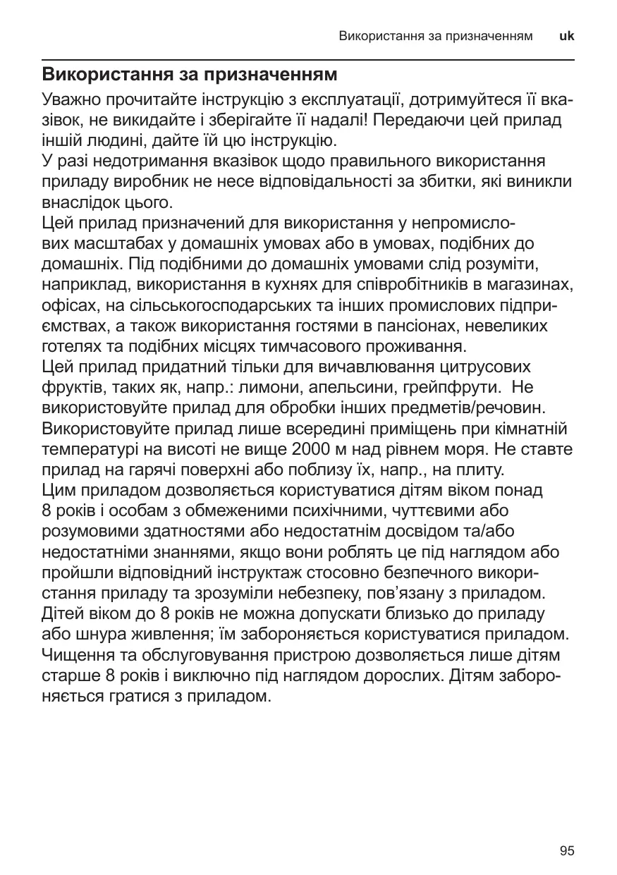 Cet appareil est conçu pour la préparation de quantités usuelles, dans le cadre d’un foyer ou d’un usage non commercial de type domestique. Citons p. ex. les cuisines du personnel dans les commerces, bureaux, exploitations agricoles et établissements artisanaux ainsi que les clients de pensions, petits hôtels et toute autre résidence de type similaire. Cet appareil est destiné à presser des agrumes, par exemple des citrons, oranges, pamplemousses. Il ne doit pas servir à transformer d’autres substances / objets. N’utilisez l’appareil que dans des pièces intérieures à température ambiante et jusqu’à 2 000 m au-dessus du niveau de la mer. Ne jamais poser l’appareil sur des surfaces chaudes (tables de cuisson par ex.) ou à proximité de celles-ci. Cet appareil peut être utilisé par des enfants à partir de 8 ans et par des personnes ayant des facultés physiques, sensorielles ou mentales réduites ou manquant d’expérience et/ou de connaissances à condition d’être surveillés ou d’avoir été informés quant à la bonne utilisation de l’appareil et d’avoir compris les dangers qui en découlent. Les enfants de moins de 8 ans doivent être tenus éloignés de l’appareil et du cordon d’alimentation et ne doivent pas utiliser l’appareil. Le nettoyage et l’entretien incombant à l’utilisateur ne doivent pas être effectués par des enfants sauf s’ils ont 8 ans ou plus et sont surveillés. Ne pas laisser les enfants jouer avec l’appareil.