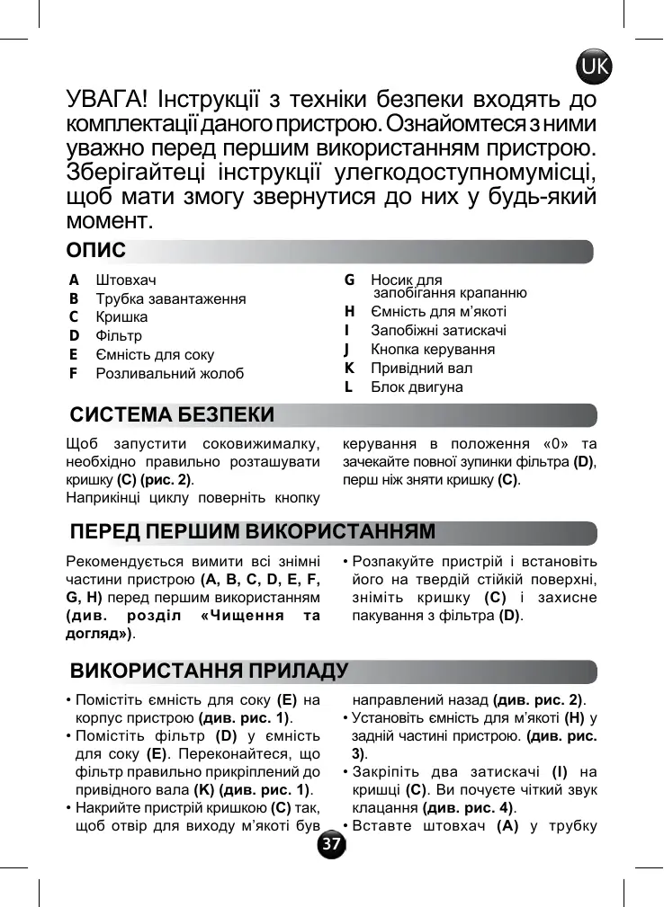 УВАГА! Інструкції з техніки безпеки входять до комплектації даного пристрою. Ознайомтеся з ними уважно перед першим використанням пристрою. Зберігайтеці інструкції улегкодоступномумісці, щоб мати змогу звернутися до них у будь-який момент. ОПИС A B C D E F