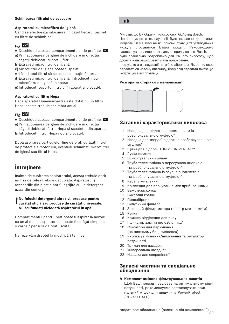 Por favor, guarde o manual de instruções e junte-o ao aspirador sempre que o entregar a terceiros. Nu trageţi de cablul de racord, ci de fişă pentru a scoate aparatul din priza de reţea. Nu trageţi şi nu striviţi cablul de legătură la reţea peste muchii ascuţite. Aveţi grijă ca ştecărul să nu se lovească de persoane, părţi ale corpului, animale sau obiecte la retractarea automată. => Ghidaţi cablul de racordare la reţea cu ajutorul ştecărului. Scoateţi aspiratorul din priză înaintea oricărei lucrări la el. Nu puneţi în funcţiune un aspirator dacă este deteriorat. În cazul existenţei unui deranjament scoateţi ştecherul din priză. Congratulations on your purchase of the Bosch GL40 vacuum cleaner. This instruction manual describes various GL40 models, which means that some of the equipment features and functions described may not apply to your model. You should only use original Bosch accessories, which have been specially developed for your vacuum cleaner, in order to achieve the best possible vacuuming results. Please keep this instruction manual. When passing the vacuum cleaner on to another person, please also hand over this instruction manual. Fold out the picture pages. Cette notice d’utilisation vaut pour différents modèles de la série GL40. Il se peut donc que toutes les caractéristiques et fonctions décrites ne concernent pas toutes votre aspirateur. Utilisez exclusivement les accessoires d'origine Bosch. Ils sont spécialement conçus pour votre aspirateur, afin d'obtenir un résultat de nettoyage optimal. Conservez cette notice d'utilisation. Si vous remettez l'aspirateur à une tierce personne, veuillez-y joindre sa notice d'utilisation. Veuillez déplier les pages illustrées!