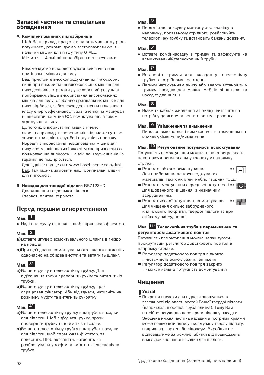 Запасні частини та спеціальне A Комплект змінних пилозбірників Щоб Ваш прилад працював на оптимальному рівні потужності, рекомендуємо застосовувати оригінальний мішок для пишу типу G ALL. 4 змінні пилозбірники з засувками Рекомендуємо використовувати виключно наші оригінальні мішки для пилу. Ваш пристрій є високопродуктивним пилососом, який при використанні високоякісних мішків для пилу дозволяє отримати дуже хороший результат прибирання. Лише використання високоякісних мішків для пилу, особливо оригінальних мішків для пилу від Bosch, забезпечує досягнення показників класу енергоефективності, зазначених на маркуван ні енергетичної мітки ЄС, всмоктування, а також утримування пилу. До того ж, використання мішків нижчої якості,наприклад, паперових мішків) може суттєво знизити тривалість служби і потужність приладу. Нарешті використання невідповідних мішків для пилу або мішків низької якості може призвести до пошкодження пилососа. На такі пошкодження наша гарантія не поширюється. Докладніше про це див. www.bosch-home.com/dustbag. Там можна замовити наші оригінальні мішки для пилососів. B Насадка для твердої підлоги BBZ123HD Для чищення гладенької підлоги (паркет, плитка, теракота...) Перед першим використанням Мал. 1 ● Надіньте ручку на шланг, щоб спрацював фіксатор. Мал. 2 a)Вставте штуцер всмоктувального шланга в гніздо b)При від'єднанні всмоктувального шланга натисніть одночасно на обидва виступи та витягніть шланг. Мал. 3* a)Вставте ручку в телескопічну трубку. Для від'єднання трохи проверніть ручку та витягніть із b)Вставте ручку в телескопічну трубку, щоб спрацював фіксатор. Аби від'єднати, натисніть на рознімну муфту та витягніть рукоятку. Мал. 4* a)Вставте телескопічну трубку в патрубок насадки для підлоги. Щоб від'єднати ручку, трохи проверніть трубку та вийміть з насадки. b)Вставте телескопічну трубку в патрубок насадки для підлоги, щоб спрацював фіксатор, та поверніть. Щоб від'єднати, натисніть на розблокувальну муфту та витягніть телескопічну