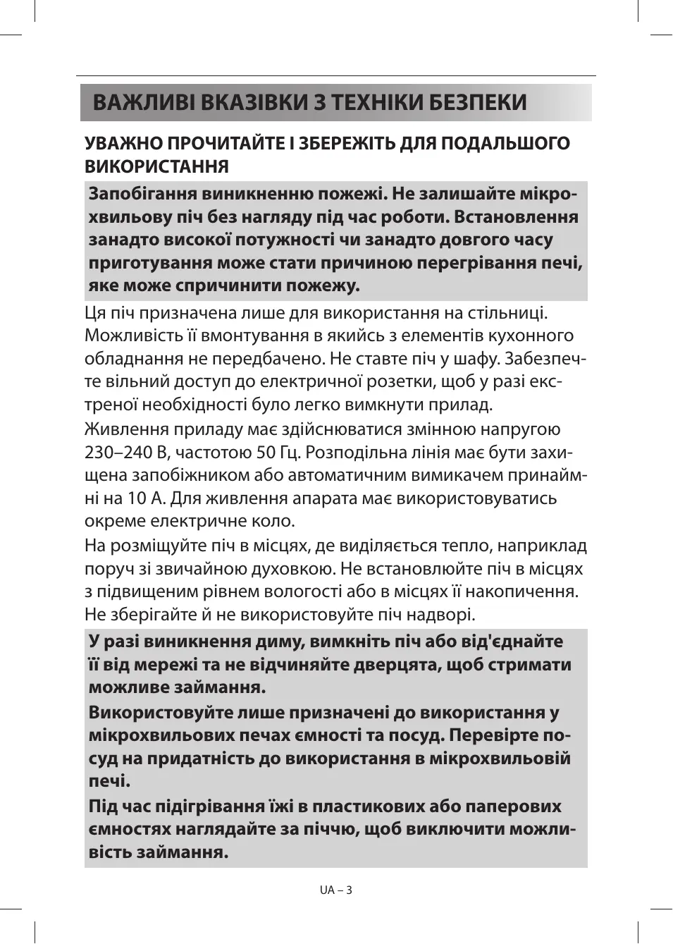- ПЕРШ НІЖ ЗВЕРТАТИСЯ ПО ДОПОМОГУ UA – 2 ВАЖЛИВІ ВКАЗІВКИ З ТЕХНІКИ БЕЗПЕКИ УВАЖНО ПРОЧИТАЙТЕ І ЗБЕРЕЖІТЬ ДЛЯ ПОДАЛЬШОГО ВИКОРИСТАННЯ Запобігання виникненню пожежі. Не залишайте мікрохвильову піч без нагляду під час роботи. Встановлення занадто високої потужності чи занадто довгого часу приготування може стати причиною перегрівання печі, яке може спричинити пожежу. Ця піч призначена лише для використання на стільниці. Можливість її вмонтування в якийсь з елементів кухонного обладнання не передбачено. Не ставте піч у шафу. Забезпечте вільний доступ до електричної розетки, щоб у разі екстреної необхідності було легко вимкнути прилад. Живлення приладу має здійснюватися змінною напругою 230–240 В, частотою 50 Гц. Розподільна лінія має бути захищена запобіжником або автоматичним вимикачем принаймні на 10 A. Для живлення апарата має використовуватись окреме електричне коло. На розміщуйте піч в місцях, де виділяється тепло, наприклад поруч зі звичайною духовкою. Не встановлюйте піч в місцях з підвищеним рівнем вологості або в місцях її накопичення. Не зберігайте й не використовуйте піч надворі. У разі виникнення диму, вимкніть піч або від'єднайте її від мережі та не відчиняйте дверцята, щоб стримати можливе займання. Використовуйте лише призначені до використання у мікрохвильових печах ємності та посуд. Перевірте посуд на придатність до використання в мікрохвильовій Під час підігрівання їжі в пластикових або паперових ємностях наглядайте за піччю, щоб виключити можливість займання. UA – 3 p. 33