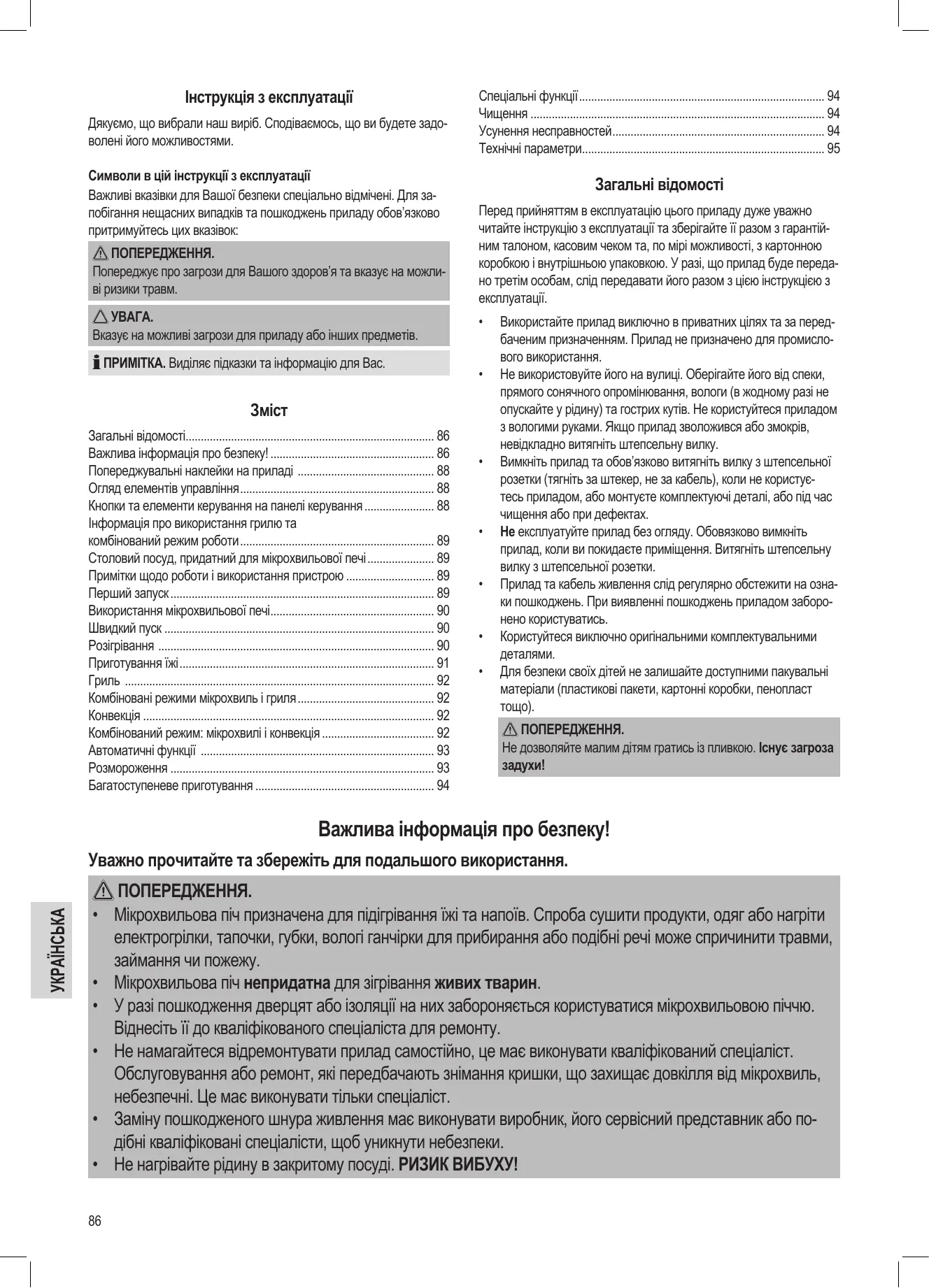 ПОПЕРЕДЖЕННЯ. Мікрохвильова піч призначена для підігрівання їжі та напоїв. Спроба сушити продукти, одяг або нагріти електрогрілки, тапочки, губки, вологі ганчірки для прибирання або подібні речі може спричинити травми, займання чи пожежу. Мікрохвильова піч непридатна для зігрівання живих тварин. У разі пошкодження дверцят або ізоляції на них забороняється користуватися мікрохвильовою піччю. Віднесіть її до кваліфікованого спеціаліста для ремонту. Не намагайтеся відремонтувати прилад самостійно, це має виконувати кваліфікований спеціаліст. Обслуговування або ремонт, які передбачають знімання кришки, що захищає довкілля від мікрохвиль, небезпечні. Це має виконувати тільки спеціаліст. Заміну пошкодженого шнура живлення має виконувати виробник, його сервісний представник або подібні кваліфіковані спеціалісти, щоб уникнути небезпеки. Не нагрівайте рідину в закритому посуді. РИЗИК ВИБУХУ!