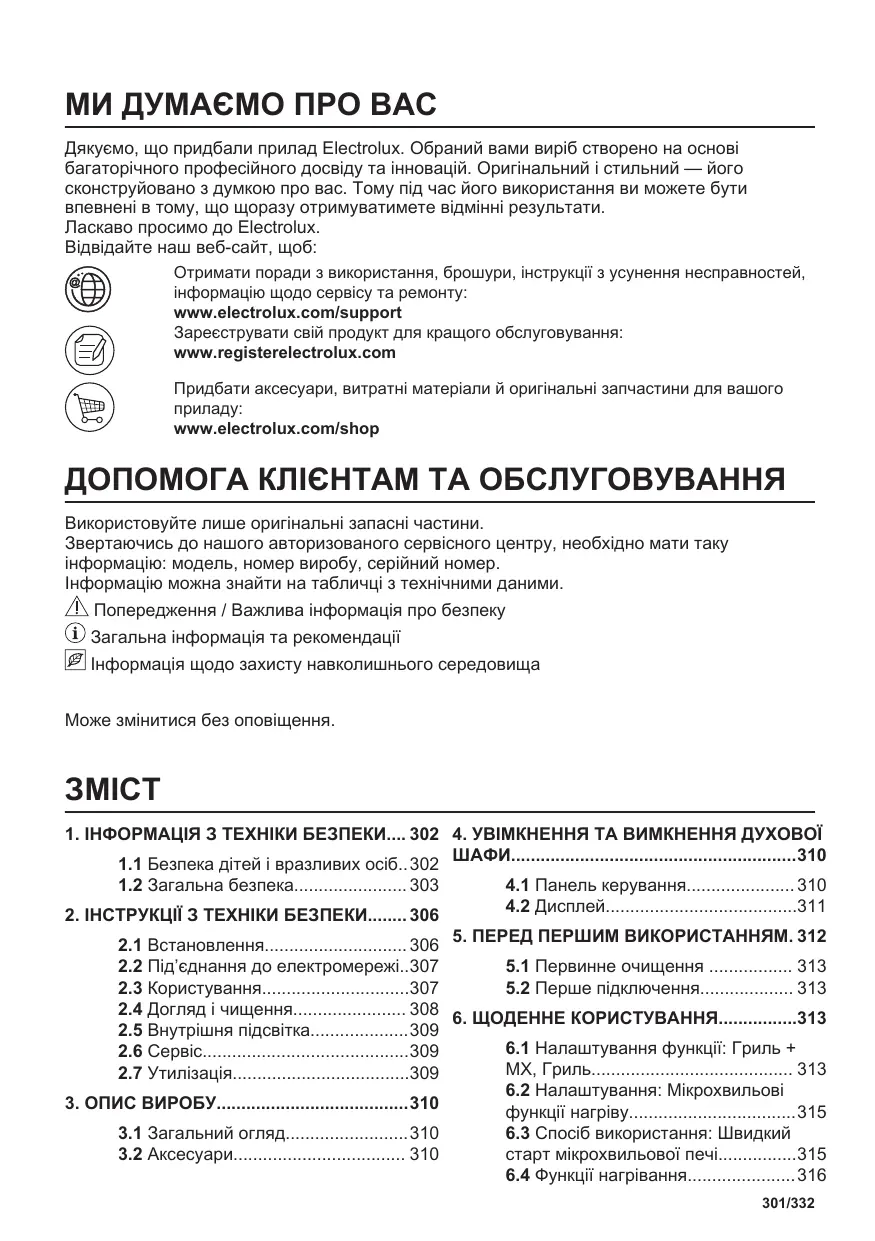 Materiály označené symbolom odovzdajte na recykláciu. Obal hoďte do príslušných kontajnerov na recykláciu. Chráňte životné prostredie a zdravie ľudí a recyklujte odpad z elektrických a elektronických spotrebičov. Nelikvidujte spotrebiče označené symbolom spolu s odpadom z domácnosti. Výrobok odovzdajte v miestnom recyklačnom zariadení alebo sa obráťte na obecný alebo mestský úrad. 300/332 МИ ДУМАЄМО ПРО ВАС Дякуємо, що придбали прилад Electrolux. Обраний вами виріб створено на основі багаторічного професійного досвіду та інновацій. Оригінальний і стильний — його сконструйовано з думкою про вас. Тому під час його використання ви можете бути впевнені в тому, що щоразу отримуватимете відмінні результати. Ласкаво просимо до Electrolux. Відвідайте наш веб-сайт, щоб: Отримати поради з використання, брошури, інструкції з усунення несправностей, інформацію щодо сервісу та ремонту: www.electrolux.com/support Зареєструвати свій продукт для кращого обслуговування: www.registerelectrolux.com Придбати аксесуари, витратні матеріали й оригінальні запчастини для вашого www.electrolux.com/shop ДОПОМОГА КЛІЄНТАМ ТА ОБСЛУГОВУВАННЯ Використовуйте лише оригінальні запасні частини. Звертаючись до нашого авторизованого сервісного центру, необхідно мати таку інформацію: модель, номер виробу, серійний номер. Інформацію можна знайти на табличці з технічними даними. Попередження / Важлива інформація про безпеку Загальна інформація та рекомендації Інформація щодо захисту навколишнього середовища Може змінитися без оповіщення.