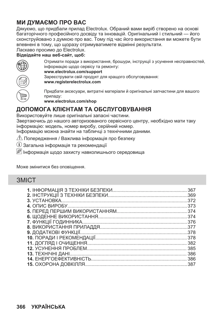 ЗМІСТ 1. ІНФОРМАЦІЯ З ТЕХНІКИ БЕЗПЕКИ 367 2. ІНСТРУКЦІЇ З ТЕХНІКИ БЕЗПЕКИ369 3. УСТАНОВКА372 4. ОПИС ВИРОБУ 373 5. ПЕРЕД ПЕРШИМ ВИКОРИСТАННЯМ 374 6. ЩОДЕННЕ ВИКОРИСТАННЯ 374 7. ФУНКЦІЇ ГОДИННИКА376 8. ВИКОРИСТАННЯ ПРИЛАДДЯ377 9. ДОДАТКОВІ ФУНКЦІЇ378 10. ПОРАДИ І РЕКОМЕНДАЦІЇ 378 11. ДОГЛЯД І ОЧИЩЕННЯ 382 12. УСУНЕННЯ ПРОБЛЕМ 385 13. ТЕХНІЧНІ ДАНІ 386 14. ЕНЕРГОЕФЕКТИВНІСТЬ 386 15. ОХОРОНА ДОВКІЛЛЯ387