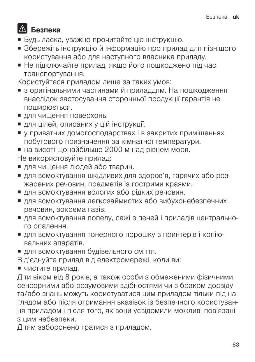 Безпека ¡ Будь ласка, уважно прочитайте цю інструкцію. ¡ Збережіть інструкцію й інформацію про прилад для пізнішого користування або для наступного власника приладу. ¡ Не підключайте прилад, якщо його пошкоджено під час транспортування. Користуйтеся приладом лише за таких умов: ¡ з оригінальними частинами й приладдям. На пошкодження внаслідок застосування сторонньої продукції гарантія не поширюється. ¡ для чищення поверхонь. ¡ для цілей, описаних у цій інструкції. ¡ у приватних домогосподарствах і в закритих приміщеннях побутового призначення за кімнатної температури. ¡ на висоті щонайбільше 2000 м над рівнем моря. Не використовуйте прилад: ¡ для чищення людей або тварин. ¡ для всмоктування шкідливих для здоров’я, гарячих або розжарених речовин, предметів із гострими краями. ¡ для всмоктування вологих або рідких речовин. ¡ для всмоктування легкозаймистих або вибухонебезпечних речовин, зокрема газів. ¡ для всмоктування попелу, сажі з печей і приладів центрального опалення. ¡ для всмоктування тонерного порошку з принтерів і копіювальних апаратів. ¡ для всмоктування будівельного сміття. Від’єднуйте прилад від електромережі, коли ви: ¡ чистите прилад. Діти віком від 8 років, а також особи з обмеженими фізичними, сенсорними або розумовими здібностями чи з браком досвіду та/або знань можуть користуватися цим приладом тільки під наглядом або після отримання вказівок із безпечного користування приладом і після того, як вони усвідомили можливі пов’язані з цим небезпеки. Дітям заборонено гратися з приладом. 83