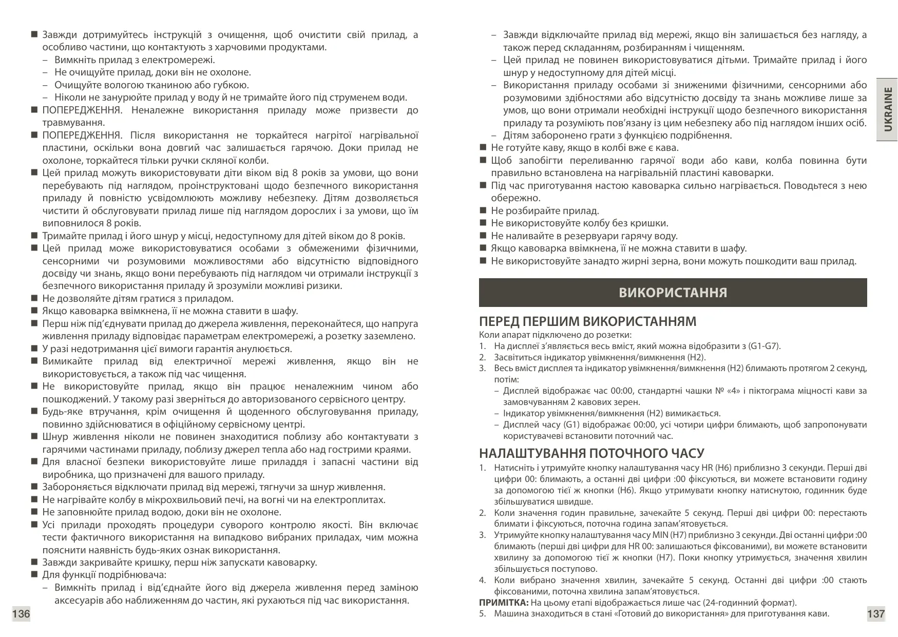 AJUSTE DE LA HORA ACTUAL 1. Mantenga presionado el botón de ajuste de la hora HR (H6) durante aproximadamente 3 segundos. Los primeros dos dígitos «00:» parpadearán mientras que los dos últimos dígitos «:00» permanecerán fijos. Podrá ajustar la hora utilizando el mismo botón (H6). Si mantiene presionado el botón, el valor de la hora aumentará progresiva y rápidamente. 2. Cuando haya seleccionado el valor de la hora (HR), espere 5 segundos. Los dos primeros dígitos «00:» permanecerán fijos y la Hora actual se memorizará. 3. Mantenga presionado el botón de ajuste de la hora MIN (H7) durante aproximadamente 3 segundos. Los últimos dos dígitos «:00» parpadearán (los dos primeros dígitos de la Hora «00:» permanecerán fijos). Podrá ajustar los minutos utilizando el mismo botón (H7). Si mantiene presionado el botón, el valor de la hora aumentará progresiva y rápidamente. 4. Cuando haya seleccionado el valor de los minutos, espere 5 segundos. Los dos últimos dígitos «:00» permanecerán fijos y los minutos actuales se memorizarán. NOTA: En ese momento, solo se mostrará la hora (en formato de 24 h). 5. El aparato estará en el modo «Listo para usar» para preparar el café.