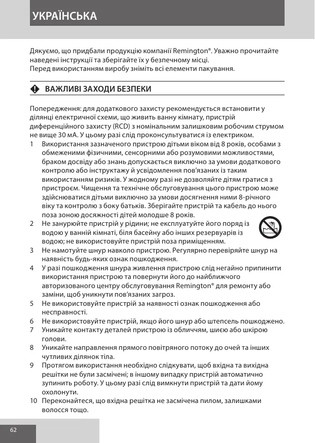Дякуємо, що придбали продукцію компанії Remington®. Уважно прочитайте наведені інструкції та зберігайте їх у безпечному місці. Перед використанням виробу зніміть всі елементи пакування. F ВАЖЛИВІ ЗАХОДИ БЕЗПЕКИ Попередження: для додаткового захисту рекомендується встановити у ділянці електричної схеми, що живить ванну кімнату, пристрій диференційного захисту (RCD) з номінальним залишковим робочим струмом не вище 30 мА. У цьому разі слід проконсультуватися із електриком. 1 Використання зазначеного пристрою дітьми віком від 8 років, особами з обмеженими фізичними, сенсорними або розумовими можливостями, браком досвіду або знань допускається виключно за умови додаткового контролю або інструктажу й усвідомлення пов’язаних із таким використанням ризиків. У жодному разі не дозволяйте дітям гратися з пристроєм. Чищення та технічне обслуговування цього пристрою може здійснюватися дітьми виключно за умови досягнення ними 8-річного віку та контролю з боку батьків. Зберігайте пристрій та кабель до нього поза зоною досяжності дітей молодше 8 років. 2 Не занурюйте пристрій у рідини; не експлуатуйте його поряд із водою у ванній кімнаті, біля басейну або інших резервуарів із водою; не використовуйте пристрій поза приміщенням. 3 Не намотуйте шнур навколо пристрою. Регулярно перевіряйте шнур на наявність будь-яких ознак пошкодження. 4 У разі пошкодження шнура живлення пристрою слід негайно припинити використання пристрою та повернути його до найближчого авторизованого центру обслуговування Remington® для ремонту або заміни, щоб уникнути пов’язаних загроз. 5 Не використовуйте пристрій за наявності ознак пошкодження або несправності. 6 Не використовуйте пристрій, якщо його шнур або штепсель пошкоджено. 7 Уникайте контакту деталей пристрою із обличчям, шиєю або шкірою 8 Уникайте направлення прямого повітряного потоку до очей та інших чутливих ділянок тіла. 9 Протягом використання необхідно слідкувати, щоб вхідна та вихідна решітки не були засмічені; в іншому випадку пристрій автоматично зупинить роботу. У цьому разі слід вимкнути пристрій та дати йому 10 Переконайтеся, що вхідна решітка не засмічена пилом, залишками волосся тощо.