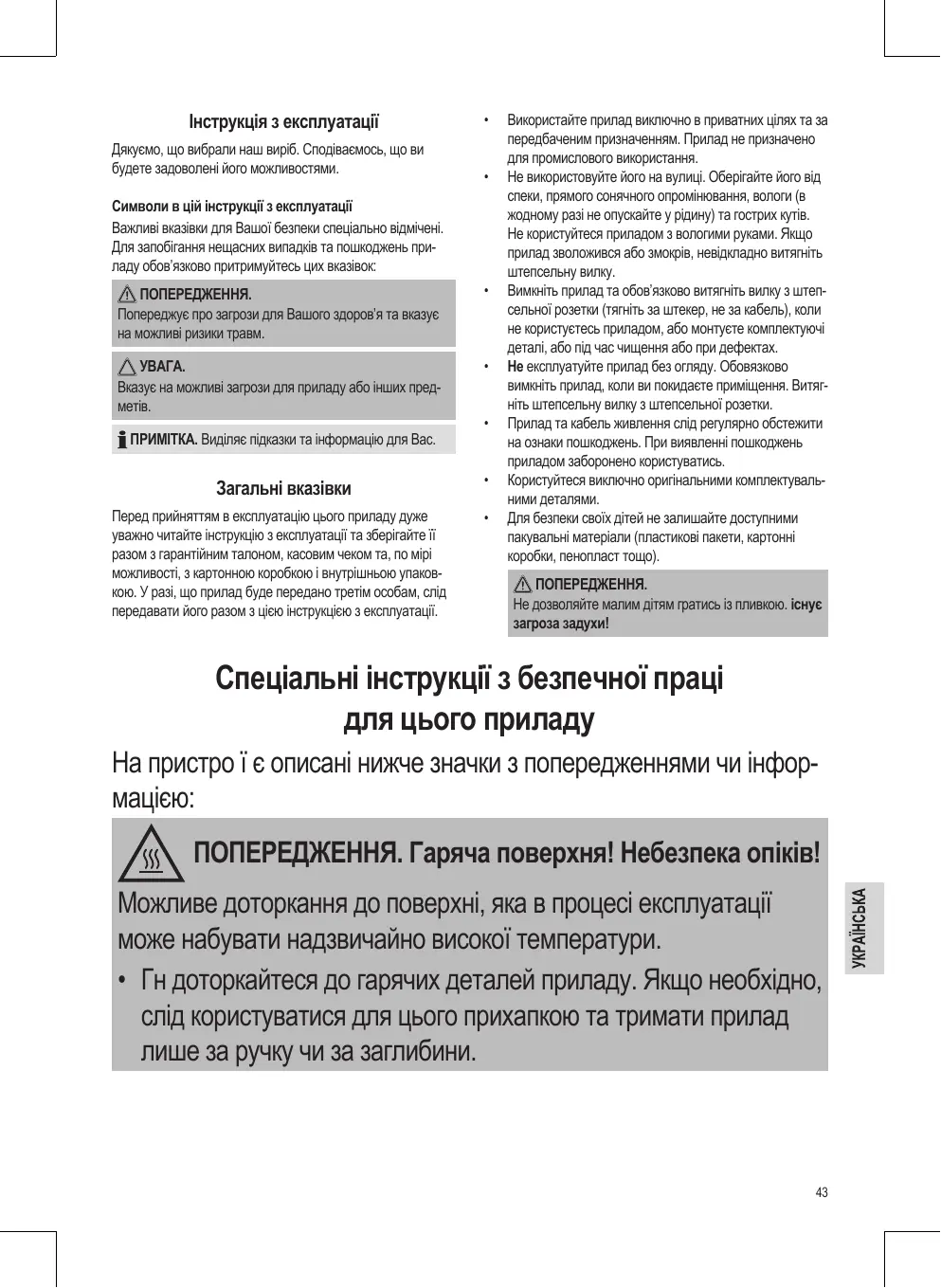 Sur le produit, vous trouverez l’icône suivant indiquant un avertissement ou des informations : AVERTISSEMENT : Surface chaude ! Risque de brûlures ! La température de la surface palpable peut devenir très élevée pendant utilisation. • Ne touchez pas les parties chaudes de l’appareil. En cas de besoin, utilisez une manique et saisissez l’appareil sur la poignée voire son creux seulement.