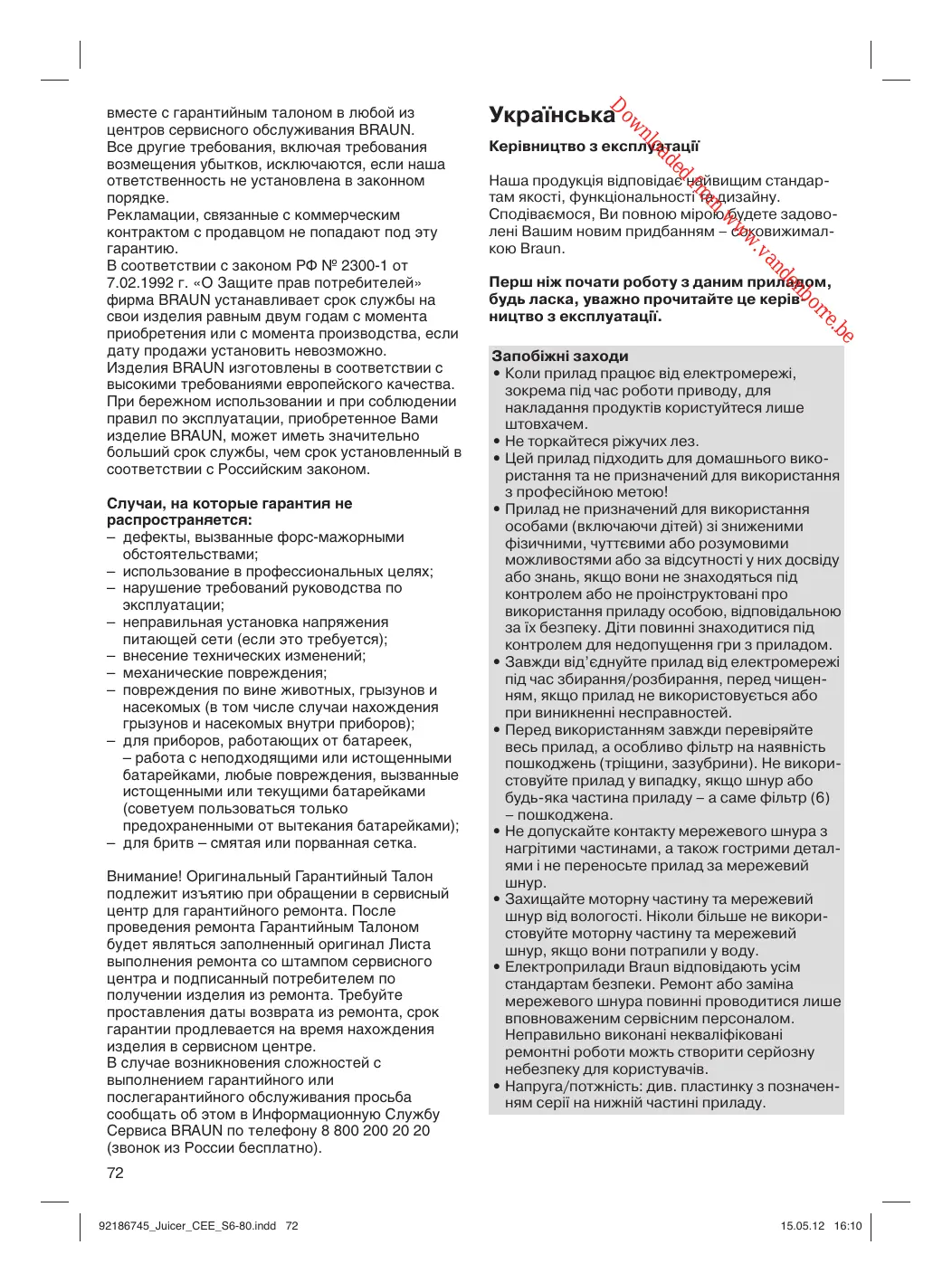 Увага! Гарантійний талон підлягає вилученню в разі звернення до сервісного центру з проханням про виконання гарантійного ремонту. Після проведення ремонту гарантійним талоном буде вважатися заповнений оригінал листа виконаного ремонту зі штампом сервісного центру та підписаний споживачем про отримання виробу з ремонту. Гарантійний термін подовжується на період, який даний виріб знаходився в сервісному центрі в ремонті. В разі виникнення труднощів з виконанням гарантійного та післягарантійного обслуговування, прохання звертатися до інформаційної служби сервісу представника компанії виробника в Україні. Телефон гарячої лінії 0 800 505 000. Дзвінки по Україні зі стаціонарних телефонних номерів є безкоштовними. Дзвінки з мобільних телефонів оплачуються згідно тарифів відповідного оператора. Також можна отримати додаткову інформацію на сервісному порталі виробника в інтернеті www.service.braun.com