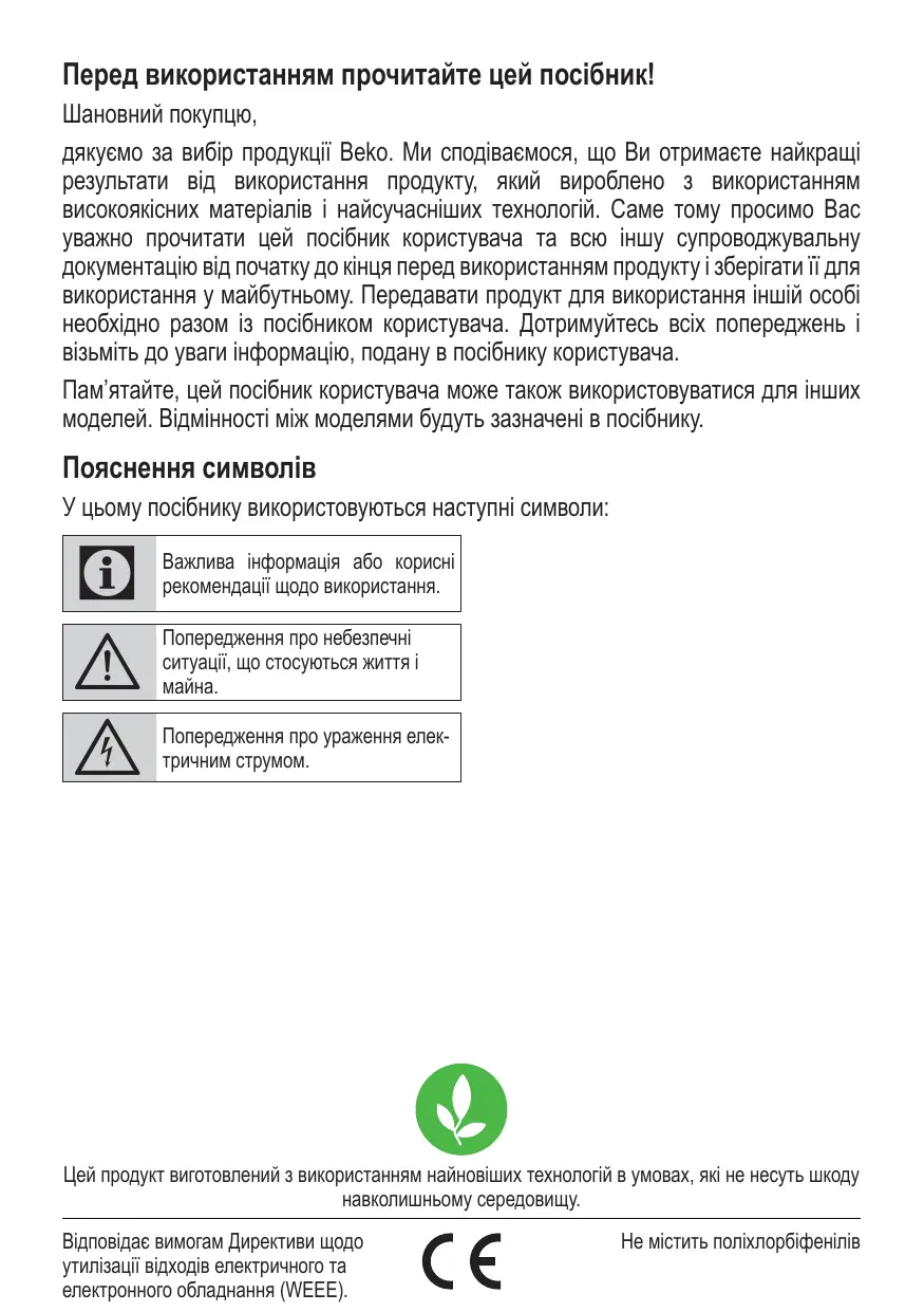Шановний покупцю, дякуємо за вибір продукції Beko. Ми сподіваємося, що Ви отримаєте найкращі результати від використання продукту, який вироблено з використанням високоякісних матеріалів і найсучасніших технологій. Саме тому просимо Вас уважно прочитати цей посібник користувача та всю іншу супроводжувальну документацію від початку до кінця перед використанням продукту і зберігати її для використання у майбутньому. Передавати продукт для використання іншій особі необхідно разом із посібником користувача. Дотримуйтесь всіх попереджень і візьміть до уваги інформацію, подану в посібнику користувача. Пам’ятайте, цей посібник користувача може також використовуватися для інших моделей. Відмінності між моделями будуть зазначені в посібнику.