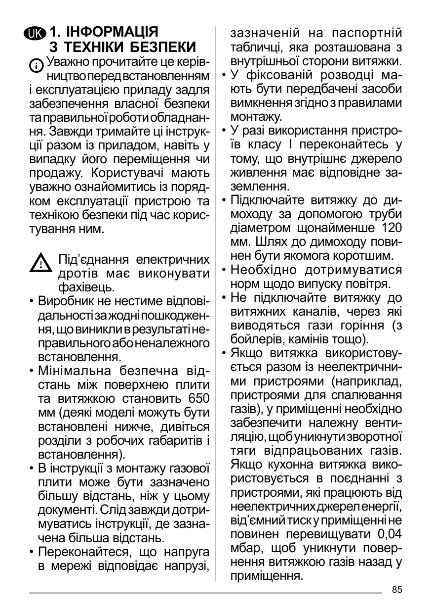 зазначеній на паспортній табличці, яка розташована з внутрішньої сторони витяжки. У фіксованій розводці мають бути передбачені засоби вимкнення згідно з правилами монтажу. У разі використання пристроїв класу I переконайтесь у тому, що внутрішнє джерело живлення має відповідне заземлення. Підключайте витяжку до димоходу за допомогою труби діаметром щонайменше 120 мм. Шлях до димоходу повинен бути якомога коротшим. Необхідно дотримуватися норм щодо випуску повітря. Не підключайте витяжку до витяжних каналів, через які виводяться гази горіння (з бойлерів, камінів тощо). Якщо витяжка використовується разом із неелектричними пристроями (наприклад, пристроями для спалювання газів), у приміщенні необхідно забезпечити належну вентиляцію, щоб уникнути зворотної тяги відпрацьованих газів. Якщо кухонна витяжка використовується в поєднанні з пристроями, які працюють від неелектричних джерел енергії, від’ємний тиск у приміщенні не повинен перевищувати 0,04 мбар, щоб уникнути повернення витяжкою газів назад у приміщення. 85