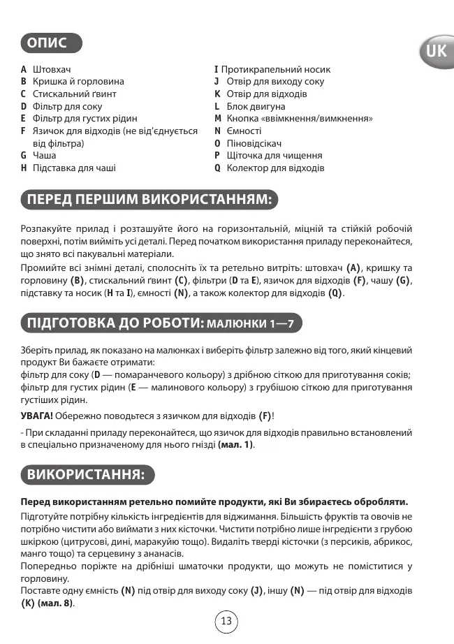 ПЕРЕД ПЕРШИМ ВИКОРИСТАННЯМ: Розпакуйте прилад і розташуйте його на горизонтальній, міцній та стійкій робочій поверхні, потім вийміть усі деталі. Перед початком використання приладу переконайтеся, що знято всі пакувальні матеріали. Промийте всі знімні деталі, сполосніть їх та ретельно витріть: штовхач (A), кришку та горловину (B), стискальний ґвинт (C), фільтри (D та E), язичок для відходів (F), чашу (G), підставку та носик (H та I), ємності (N), а також колектор для відходів (Q).