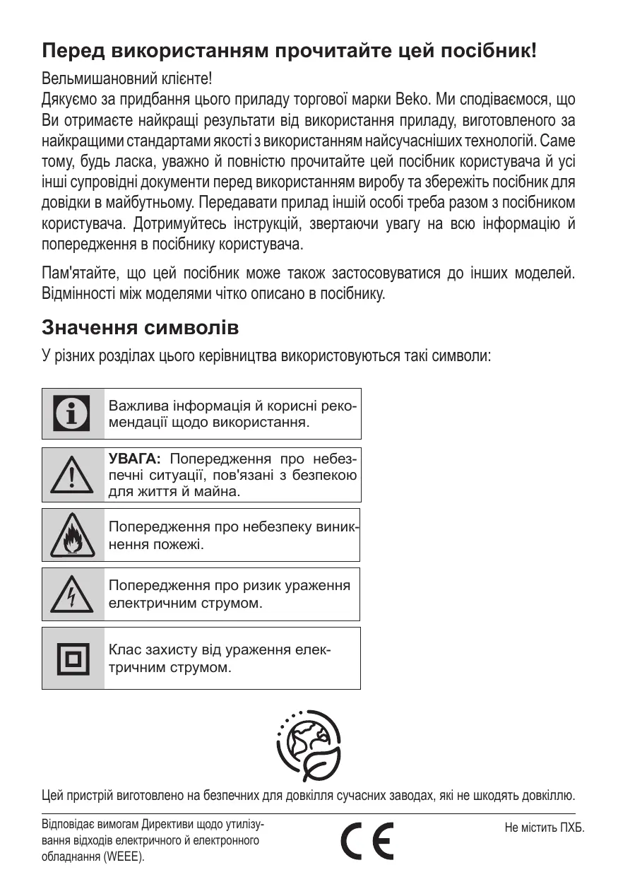 Перед використанням прочитайте цей посібник! Вельмишановний клієнте! Дякуємо за придбання цього приладу торгової марки Beko. Ми сподіваємося, що Ви отримаєте найкращі результати від використання приладу, виготовленого за найкращими стандартами якості з використанням найсучасніших технологій. Саме тому, будь ласка, уважно й повністю прочитайте цей посібник користувача й усі інші супровідні документи перед використанням виробу та збережіть посібник для довідки в майбутньому. Передавати прилад іншій особі треба разом з посібником користувача. Дотримуйтесь інструкцій, звертаючи увагу на всю інформацію й попередження в посібнику користувача. Пам'ятайте, що цей посібник може також застосовуватися до інших моделей. Відмінності між моделями чітко описано в посібнику.