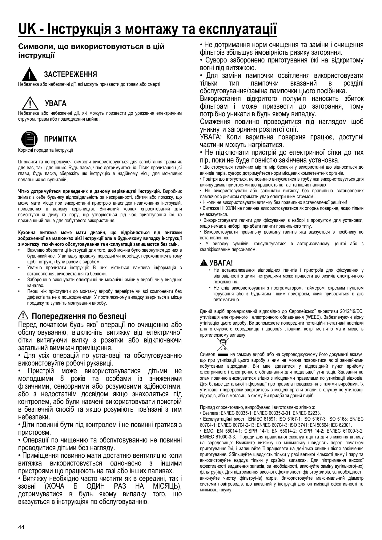 на самому виробі або на супроводжуючому його документі вказує, Символ що при утилізації цього виробу з ним не можна поводитися як зі звичайними побутовими відходами. Він має здаватися у відповідний пункт прийому електричного і електронного обладнання для подальшої утилізації. Здавання на злам повинно виконуватися згідно з місцевими правилами по утилізації відходів. Для більше детальної інформації про правила поводження з такими виробами, їх утилізації і переробки звертайтесь в місцеві органи влади, в службу по утилізації відходів, або в магазин, в якому Ви придбали даний виріб. Прилад спроектовано, випробувано і виготовлено згідно з: • Безпека: EN/IEC 60335-1; EN/IEC 60335-2-31, EN/IEC 62233. • Експлуатаційні якості: EN/IEC 61591; ISO 5167-1; ISO 5167-3; ISO 5168; EN/IEC 60704-1; EN/IEC 60704-2-13; EN/IEC 60704-3; ISO 3741; EN 50564; IEC 62301. • EMC: EN 55014-1; CISPR 14-1; EN 55014-2; CISPR 14-2; EN/IEC 61000-3-2; EN/IEC 61000-3-3. Поради для правильної експлуатації та для зниження впливу на середовище: Вмикайте витяжку на мінімальну швидкість перед початком приготування їжі, і залишайте її працювати на декілька хвилин після закінчення приготування. Збільшуйте швидкість тільки у разі великої кількості диму і пару та використовуйте наддув тільки у крайніх випадках. Для підтримання високої ефективності видалення запахів, за необхідності, виконуйте заміну вугільного(-их) фільтру(-ів). Для підтримання високої ефективності фільтру жирів, за необхідності, виконуйте чистку фільтру(-ів) жирів. Використовуйте максимальний діаметр системи повітроводів, що вказаний у інструкції для оптимізації ефективності та мінімізації шуму.