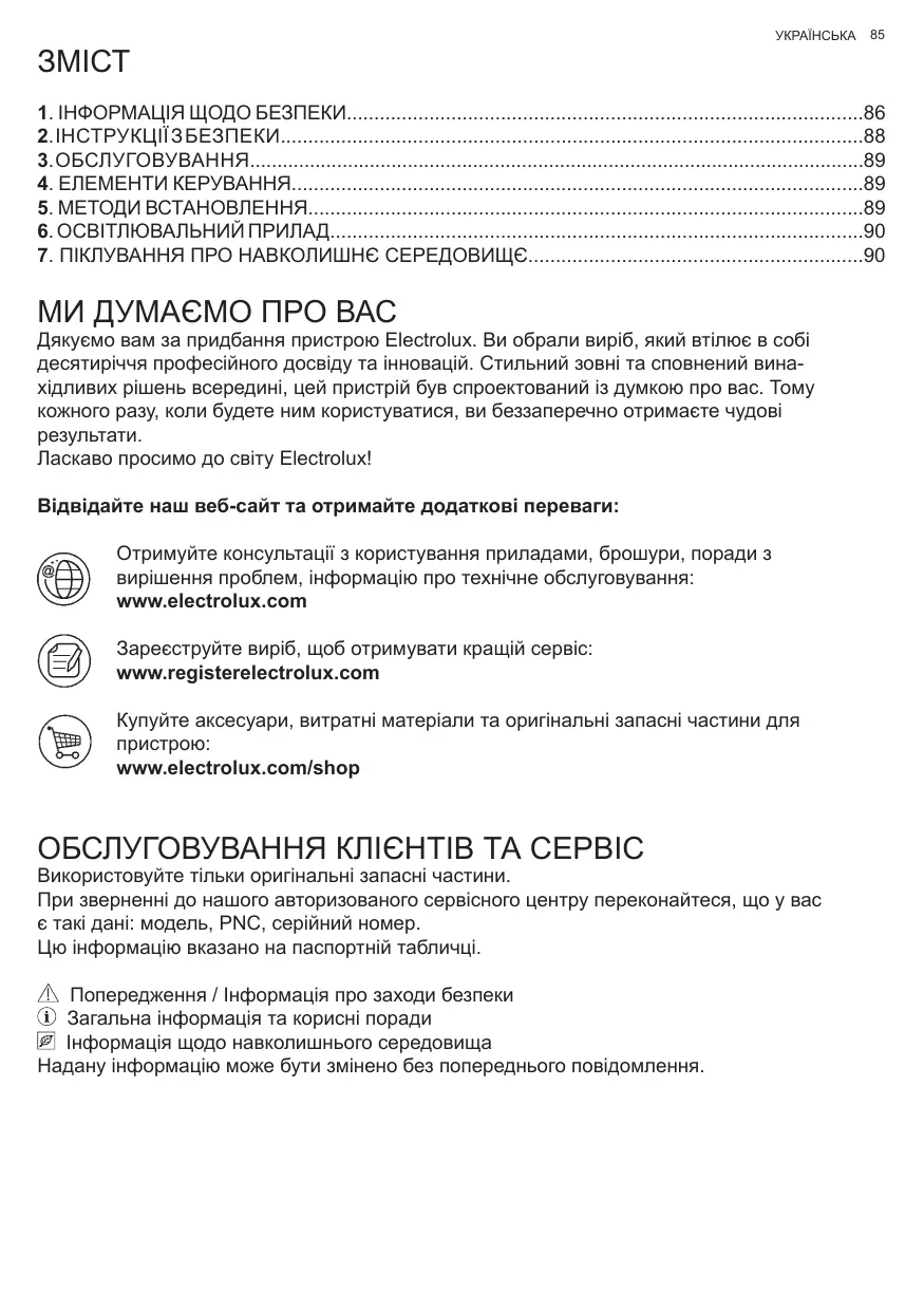 МИ ДУМАЄМО ПРО ВАС Дякуємо вам за придбання пристрою Electrolux. Ви обрали виріб, який втілює в собі десятиріччя професійного досвіду та інновацій. Стильний зовні та сповнений винахідливих рішень всередині, цей пристрій був спроектований із думкою про вас. Тому кожного разу, коли будете ним користуватися, ви беззаперечно отримаєте чудові результати. Ласкаво просимо до світу Electrolux! Відвідайте наш веб-сайт та отримайте додаткові переваги: Отримуйте консультації з користування приладами, брошури, поради з вирішення проблем, інформацію про технічне обслуговування: www.electrolux.com Зареєструйте виріб, щоб отримувати кращій сервіс: www.registerelectrolux.com Купуйте аксесуари, витратні матеріали та оригінальні запасні частини для www.electrolux.com/shop ОБСЛУГОВУВАННЯ КЛІЄНТІВ ТА СЕРВІС Використовуйте тільки оригінальні запасні частини. При зверненні до нашого авторизованого сервісного центру переконайтеся, що у вас є такі дані: модель, PNC, серійний номер. Цю інформацію вказано на паспортній табличці. Попередження / Інформація про заходи безпеки Загальна інформація та корисні поради Інформація щодо навколишнього середовища Надану інформацію може бути змінено без попереднього повідомлення.