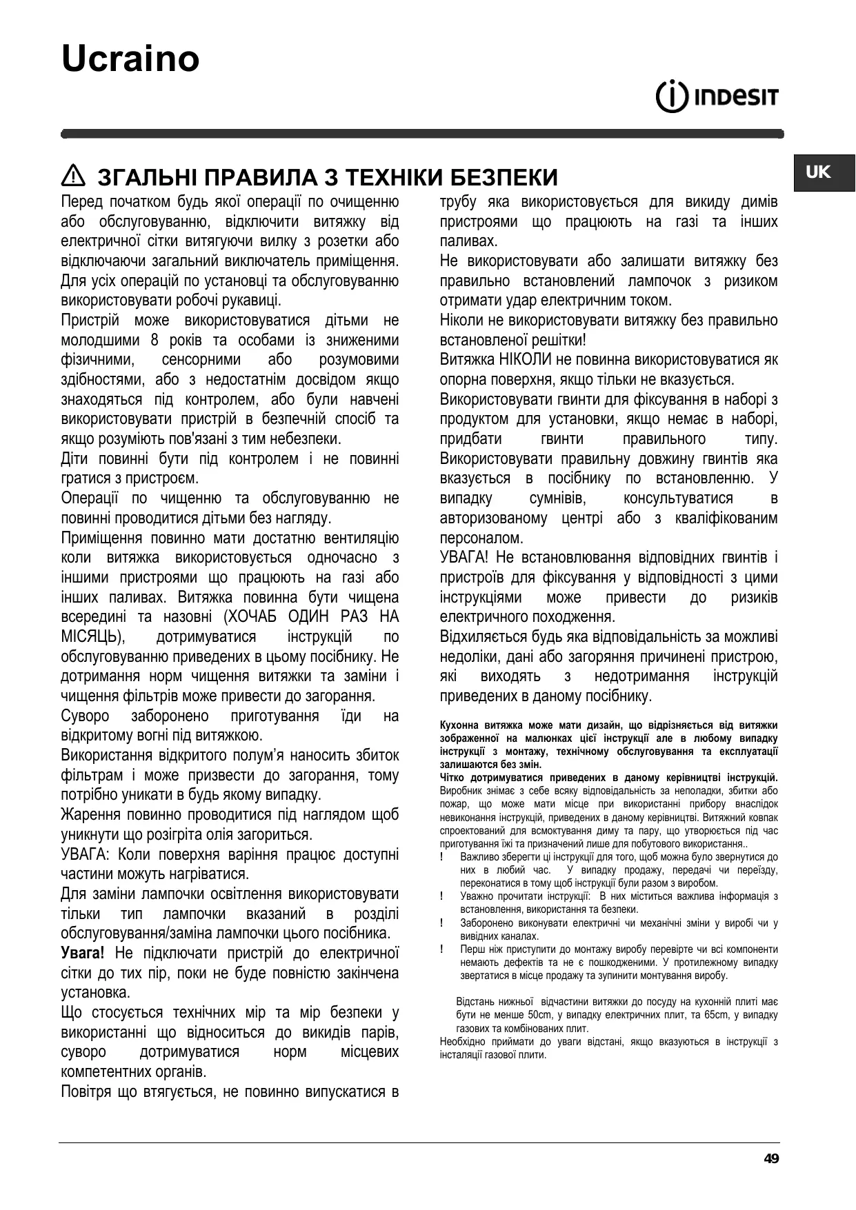 Ucraino ЗГАЛЬНІ ПРАВИЛА З ТЕХНІКИ БЕЗПЕКИ Перед початком будь якої операції по очищенню або обслуговуванню, відключити витяжку від електричної сітки витягуючи вилку з розетки або відключаючи загальний виключатель приміщення. Для усіх операцій по установці та обслуговуванню використовувати робочі рукавиці. Пристрій може використовуватися дітьми не молодшими 8 років та особами із зниженими фізичними, сенсорними або розумовими здібностями, або з недостатнім досвідом якщо знаходяться під контролем, або були навчені використовувати пристрій в безпечній спосіб та якщо розуміють пов'язані з тим небезпеки. Діти повинні бути під контролем і не повинні гратися з пристроєм. Операції по чищенню та обслуговуванню не повинні проводитися дітьми без нагляду. Приміщення повинно мати достатню вентиляцію коли витяжка використовується одночасно з іншими пристроями що працюють на газі або інших паливах. Витяжка повинна бути чищена всередині та назовні (ХОЧАБ ОДИН РАЗ НА МІСЯЦЬ), дотримуватися інструкцій по обслуговуванню приведених в цьому посібнику. Не дотримання норм чищення витяжки та заміни і чищення фільтрів може привести до загорання. Суворо заборонено приготування їди на відкритому вогні під витяжкою. Використання відкритого полум’я наносить збиток фільтрам і може призвести до загорання, тому потрібно уникати в будь якому випадку. Жарення повинно проводитися під наглядом щоб уникнути що розігріта олія загориться. УВАГА: Коли поверхня варіння працює доступні частини можуть нагріватися. Для заміни лампочки освітлення використовувати тільки тип лампочки вказаний в розділі обслуговування/заміна лампочки цього посібника. Увага! Не підключати пристрій до електричної сітки до тих пір, поки не буде повністю закінчена установка. Що стосується технічних мір та мір безпеки у використанні що відноситься до викидів парів, суворо дотримуватися норм місцевих компетентних органів. Повітря що втягується, не повинно випускатися в
