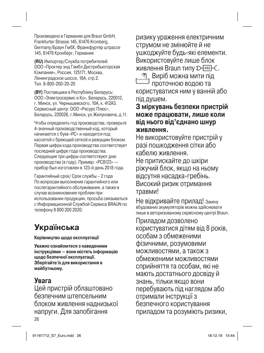 100-240 V/Вольт, 50-60 Hz/Герц,7 W/Ватт. Виготовлено Проктер енд Гембл Меньюфекчурінг ГмбХ у Німеччині: Procter & Gamble Manufacturing GmbH Werk Walldürn, Waldstr. 9, 74731 Walldürn, Germany. UA: Адреса в Україні: ТОВ «Проктер енд Гембл Трейдінг Україна», Україна, 04070, м.Київ, вул. Набережно-Хрещатицька, 5/13, корпус літ. А. Тел. (0-800) 505-000. www.pg.com.ua, www.service.braun.com Для визначення року виробництва перевірте 4-значний виробничий код, який починається з літер «PC» і знаходиться під касетою із сіткою для гоління та ріжучим блоком. Перша цифра коду відповідає останній цифрі року виробництва. Наступні три цифри відповідають дню виробництва (у році). Приклад: «PC8123» — прилад було виготовлено у 123-й день 2018 року. 27