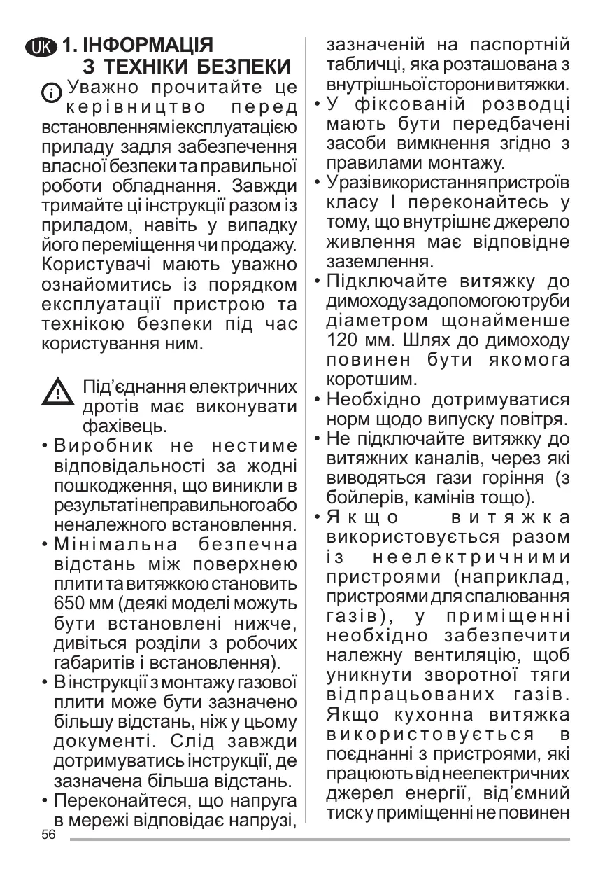 Les dispositifs de sectionnement doivent être montés dans l’installation fixe conformément aux normes sur les systèmes de câblage. Pour les appareils de Classe I, s’assurer que l’installation électrique de votre intérieur dispose d’une mise à la terre adéquate. Reliez l’aspirateur du conduit de cheminée avec un tube ayant un diamètre minimum de 120 mm. Le parcours des fumées doit être le plus court possible. Respecter toutes les normes concernant l’évacuation de l’air. Ne reliez pas la hotte aspirante aux conduits de cheminée qui acheminent les fumées de combustion (par ex. de chaudières, de cheminées, etc.). Si vous utilisez l’aspirateur en même temps que des appareils non électriques (par ex. fonctionnant au gaz), veillez à ce que la pièce soit adéquatement ventilée, afin d’empêcher le retour du flux des gaz d’évacuation. Si vous utilisez la hotte de cuisine en même temps que des appareils non alimentés à l’électricité, la pression négative dans la pièce ne doit pas dépasser 0,04 mbar, afin d’éviter que les fumées