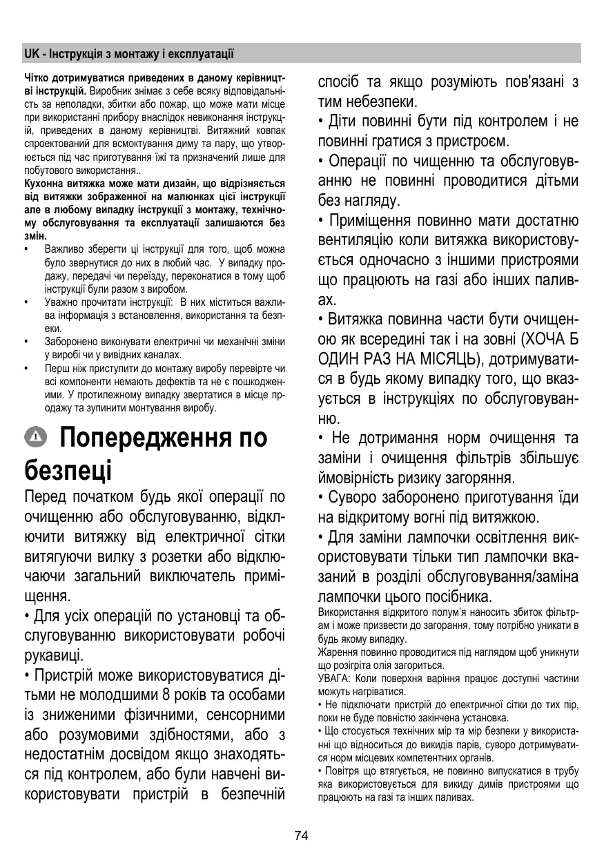 UK - Інструкція з монтажу і експлуатації Чітко дотримуватися приведених в даному керівництві інструкцій. Виробник знімає з себе всяку відповідальність за неполадки, збитки або пожар, що може мати місце при використанні прибору внаслідок невиконання інструкцій, приведених в даному керівництві. Витяжний ковпак спроектований для всмоктування диму та пару, що утворюється під час приготування їжі та призначений лише для побутового використання.. Кухонна витяжка може мати дизайн, що відрізняється від витяжки зображенної на малюнках цієї інструкції але в любому випадку інструкції з монтажу, технічному обслуговування та експлуатації залишаются без