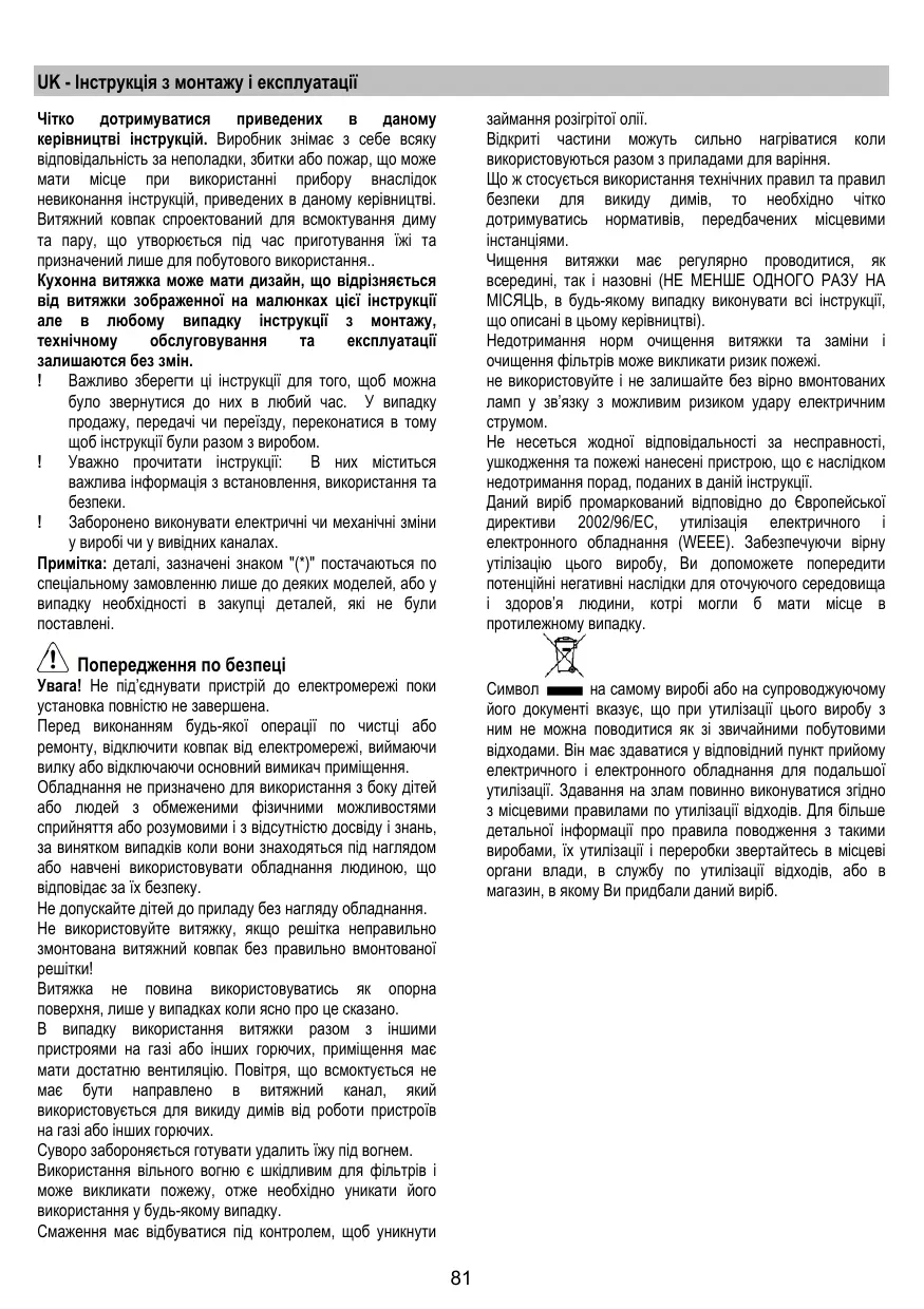 UK - Інструкція з монтажу і експлуатації займання розігрітої олії. Відкриті частини можуть сильно нагріватися коли використовуються разом з приладами для варіння. Що ж стосується використання технічних правил та правил безпеки для викиду димів, то необхідно чітко дотримуватись нормативів, передбачених місцевими інстанціями. Чищення витяжки має регулярно проводитися, як всередині, так і назовні (НЕ МЕНШЕ ОДНОГО РАЗУ НА МІСЯЦЬ, в будь-якому випадку виконувати всі інструкції, що описані в цьому керівництві). Недотримання норм очищення витяжки та заміни і очищення фільтрів може викликати ризик пожежі. не використовуйте і не залишайте без вірно вмонтованих ламп у зв’язку з можливим ризиком удару електричним Не несеться жодної відповідальності за несправності, ушкодження та пожежі нанесені пристрою, що є наслідком недотримання порад, поданих в даній інструкції. Даний виріб промаркований відповідно до Європейської директиви 2002/96/EC, утилізація електричного і електронного обладнання (WEEE). Забезпечуючи вірну утілізацію цього виробу, Ви допоможете попередити потенційні негативні наслідки для оточуючого середовища і здоров’я людини, котрі могли б мати місце в протилежному випадку. Чітко дотримуватися приведених в даному керівництві інструкцій. Виробник знімає з себе всяку відповідальність за неполадки, збитки або пожар, що може мати місце при використанні прибору внаслідок невиконання інструкцій, приведених в даному керівництві. Витяжний ковпак спроектований для всмоктування диму та пару, що утворюється під час приготування їжі та призначений лише для побутового використання.. Кухонна витяжка може мати дизайн, що відрізняється від витяжки зображенної на малюнках цієї інструкції але в любому випадку інструкції з монтажу, обслуговування експлуатації залишаются без змін. Важливо зберегти ці інструкції для того, щоб можна було звернутися до них в любий час. У випадку продажу, передачі чи переїзду, переконатися в тому щоб інструкції були разом з виробом. Уважно прочитати інструкції: В них міститься важлива інформація з встановлення, використання та