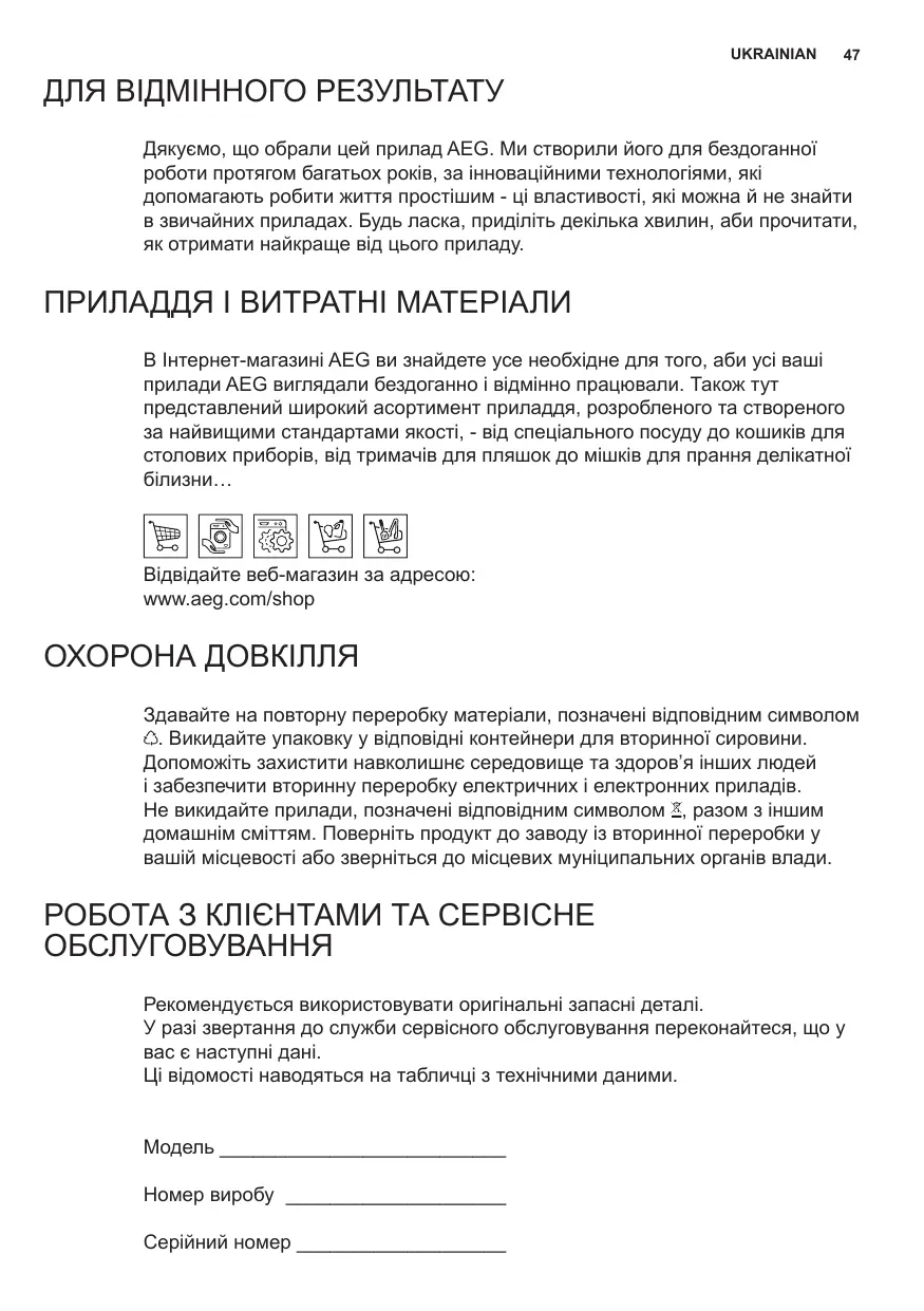 ДЛЯ ВІДМІННОГО РЕЗУЛЬТАТУ Дякуємо, що обрали цей прилад AEG. Ми створили його для бездоганної роботи протягом багатьох років, за інноваційними технологіями, які допомагають робити життя простішим - ці властивості, які можна й не знайти в звичайних приладах. Будь ласка, приділіть декілька хвилин, аби прочитати, як отримати найкраще від цього приладу. ПРИЛАДДЯ І ВИТРАТНІ МАТЕРІАЛИ В Інтернет-магазині AEG ви знайдете усе необхідне для того, аби усі ваші прилади AEG виглядали бездоганно і відмінно працювали. Також тут представлений широкий асортимент приладдя, розробленого та створеного за найвищими стандартами якості, - від спеціального посуду до кошиків для столових приборів, від тримачів для пляшок до мішків для прання делікатної