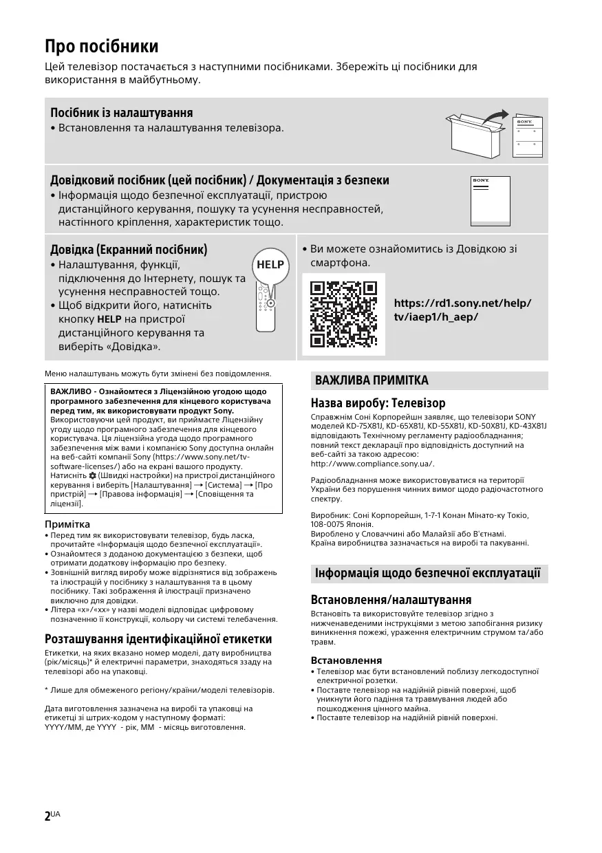 Довідка (Екранний посібник) • Налаштування, функції, підключення до Інтернету, пошук та усунення несправностей тощо. • Щоб відкрити його, натисніть кнопку HELP на пристрої дистанційного керування та виберіть «Довідка». Меню налаштувань можуть бути змінені без повідомлення. ВАЖЛИВО - Ознайомтеся з Ліцензійною угодою щодо програмного забезпечення для кінцевого користувача перед тим, як використовувати продукт Sony. Використовуючи цей продукт, ви приймаєте Ліцензійну угоду щодо програмного забезпечення для кінцевого користувача. Ця ліцензійна угода щодо програмного забезпечення між вами і компанією Sony доступна онлайн на веб-сайті компанії Sony (https://www.sony.net/tvsoftware-licenses/) або на екрані вашого продукту. Натисніть (Швидкі настройки) на пристрої дистанційного керування і виберіть [Налаштування] [Система] [Про пристрій] [Правова інформація] [Сповіщення та ліцензії].