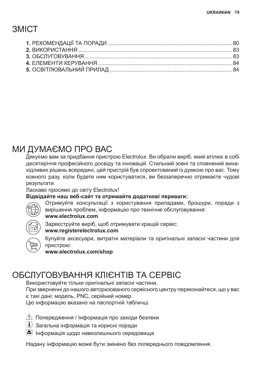 Дякуємо вам за придбання пристрою Electrolux. Ви обрали виріб, який втілює в собі десятиріччя професійного досвіду та інновацій. Стильний зовні та сповнений винахідливих рішень всередині, цей пристрій був спроектований із думкою про вас. Тому кожного разу, коли будете ним користуватися, ви беззаперечно отримаєте чудові результати. Ласкаво просимо до світу Electrolux! Відвідайте наш веб-сайт та отримайте додаткові переваги: Отримуйте консультації з користування приладами, брошури, поради з вирішення проблем, інформацію про технічне обслуговування: www.electrolux.com Зареєструйте виріб, щоб отримувати кращій сервіс: www.registerelectrolux.com Купуйте аксесуари, витратні матеріали та оригінальні запасні частини для пристрою: www.electrolux.com/shop