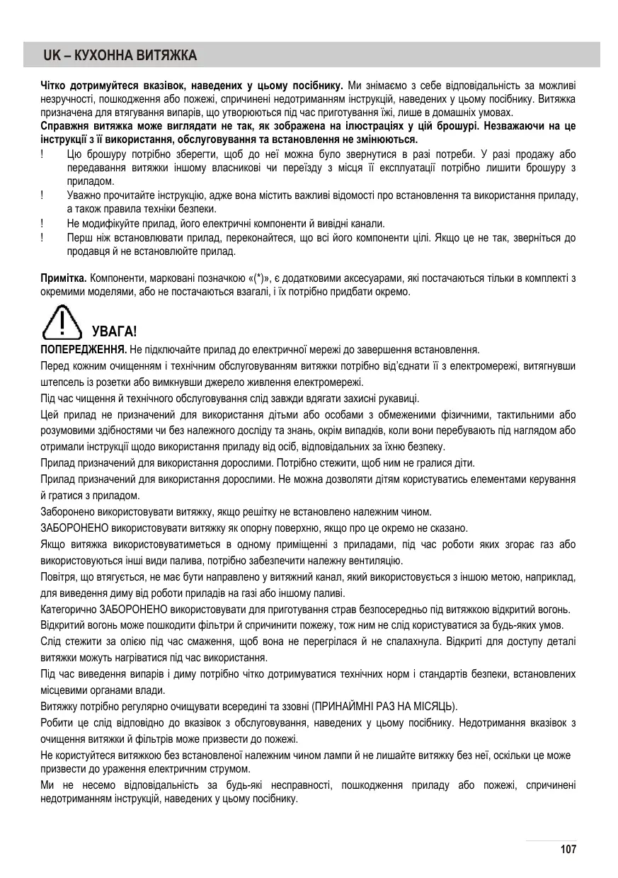 UK – КУХОННА ВИТЯЖКА Чітко дотримуйтеся вказівок, наведених у цьому посібнику. Ми знімаємо з себе відповідальність за можливі незручності, пошкодження або пожежі, спричинені недотриманням інструкцій, наведених у цьому посібнику. Витяжка призначена для втягування випарів, що утворюються під час приготування їжі, лише в домашніх умовах. Справжня витяжка може виглядати не так, як зображена на ілюстраціях у цій брошурі. Незважаючи на це інструкції з її використання, обслуговування та встановлення не змінюються. ! Цю брошуру потрібно зберегти, щоб до неї можна було звернутися в разі потреби. У разі продажу або передавання витяжки іншому власникові чи переїзду з місця її експлуатації потрібно лишити брошуру з приладом. ! Уважно прочитайте інструкцію, адже вона містить важливі відомості про встановлення та використання приладу, а також правила техніки безпеки. ! Не модифікуйте прилад, його електричні компоненти й вивідні канали. ! Перш ніж встановлювати прилад, переконайтеся, що всі його компоненти цілі. Якщо це не так, зверніться до продавця й не встановлюйте прилад. Примітка. Компоненти, марковані позначкою «(*)», є додатковими аксесуарами, які постачаються тільки в комплекті з окремими моделями, або не постачаються взагалі, і їх потрібно придбати окремо.