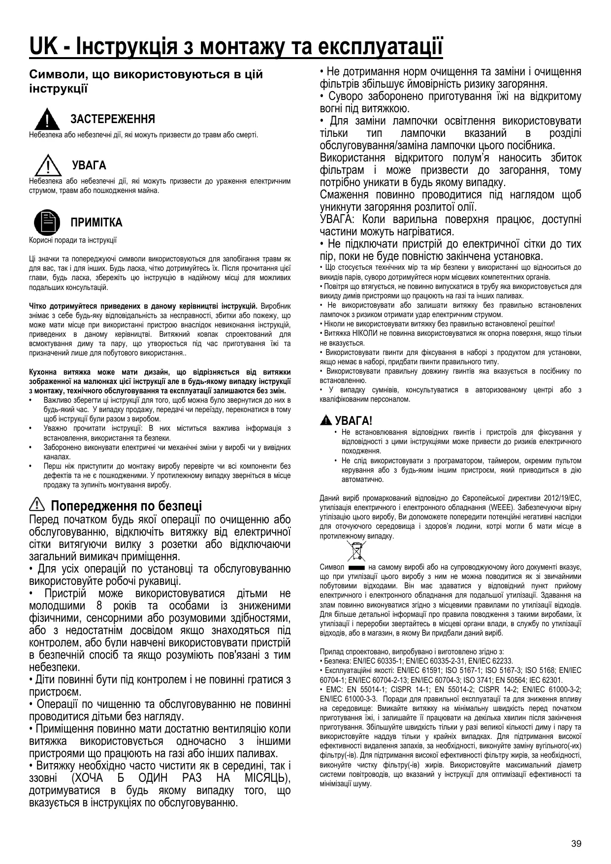 на самому виробі або на супроводжуючому його документі вказує, Символ що при утилізації цього виробу з ним не можна поводитися як зі звичайними побутовими відходами. Він має здаватися у відповідний пункт прийому електричного і електронного обладнання для подальшої утилізації. Здавання на злам повинно виконуватися згідно з місцевими правилами по утилізації відходів. Для більше детальної інформації про правила поводження з такими виробами, їх утилізації і переробки звертайтесь в місцеві органи влади, в службу по утилізації відходів, або в магазин, в якому Ви придбали даний виріб. Прилад спроектовано, випробувано і виготовлено згідно з: • Безпека: EN/IEC 60335-1; EN/IEC 60335-2-31, EN/IEC 62233. • Експлуатаційні якості: EN/IEC 61591; ISO 5167-1; ISO 5167-3; ISO 5168; EN/IEC 60704-1; EN/IEC 60704-2-13; EN/IEC 60704-3; ISO 3741; EN 50564; IEC 62301. • EMC: EN 55014-1; CISPR 14-1; EN 55014-2; CISPR 14-2; EN/IEC 61000-3-2; EN/IEC 61000-3-3. Поради для правильної експлуатації та для зниження впливу на середовище: Вмикайте витяжку на мінімальну швидкість перед початком приготування їжі, і залишайте її працювати на декілька хвилин після закінчення приготування. Збільшуйте швидкість тільки у разі великої кількості диму і пару та використовуйте наддув тільки у крайніх випадках. Для підтримання високої ефективності видалення запахів, за необхідності, виконуйте заміну вугільного(-их) фільтру(-ів). Для підтримання високої ефективності фільтру жирів, за необхідності, виконуйте чистку фільтру(-ів) жирів. Використовуйте максимальний діаметр системи повітроводів, що вказаний у інструкції для оптимізації ефективності та мінімізації шуму.