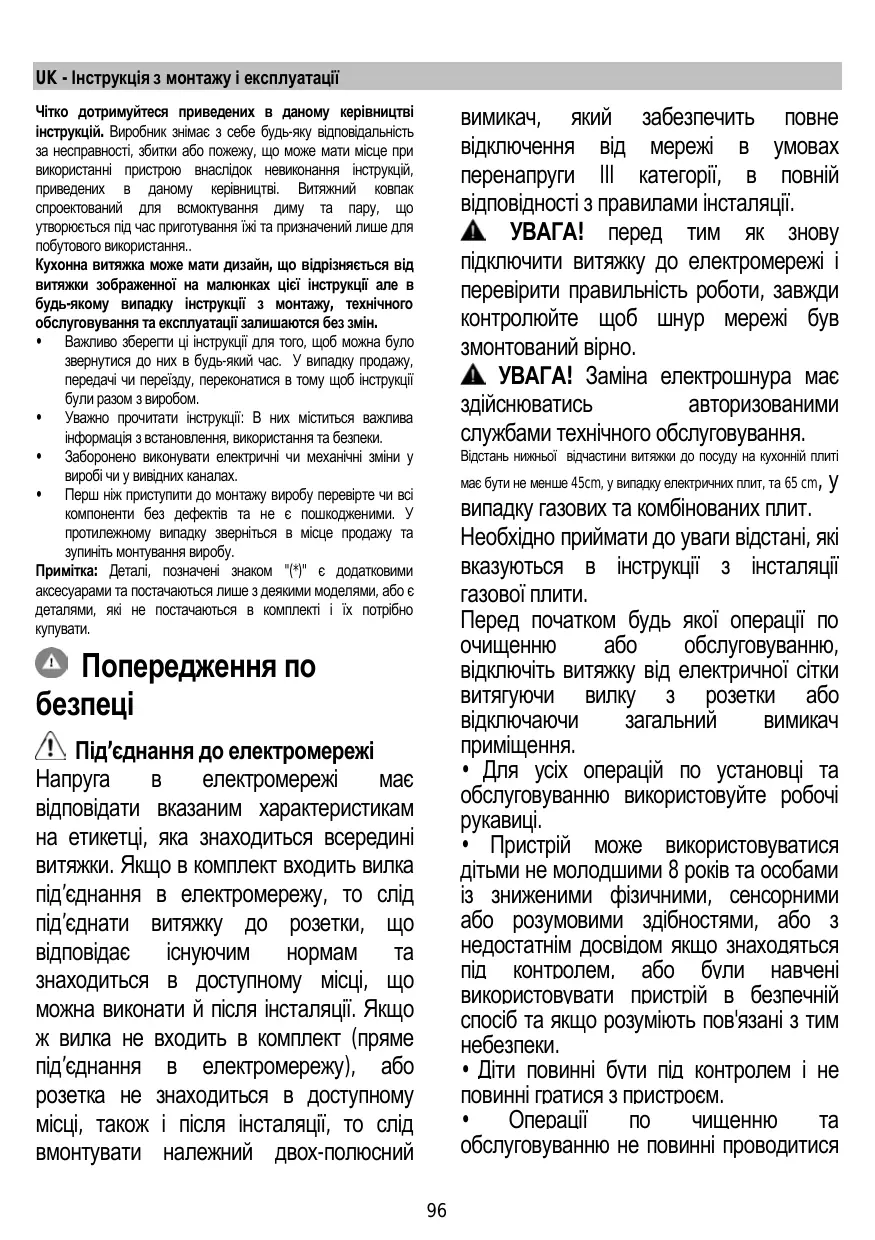 Попередження по безпеці Під’єднання до електромережі Напруга в електромережі має відповідати вказаним характеристикам на етикетці, яка знаходиться всередині витяжки. Якщо в комплект входить вилка під’єднання в електромережу, то слід під’єднати витяжку до розетки, що відповідає існуючим нормам та знаходиться в доступному місці, що можна виконати й після інсталяції. Якщо ж вилка не входить в комплект (пряме під’єднання в електромережу), або розетка не знаходиться в доступному місці, також і після інсталяції, то слід вмонтувати належний двох-полюсний 96