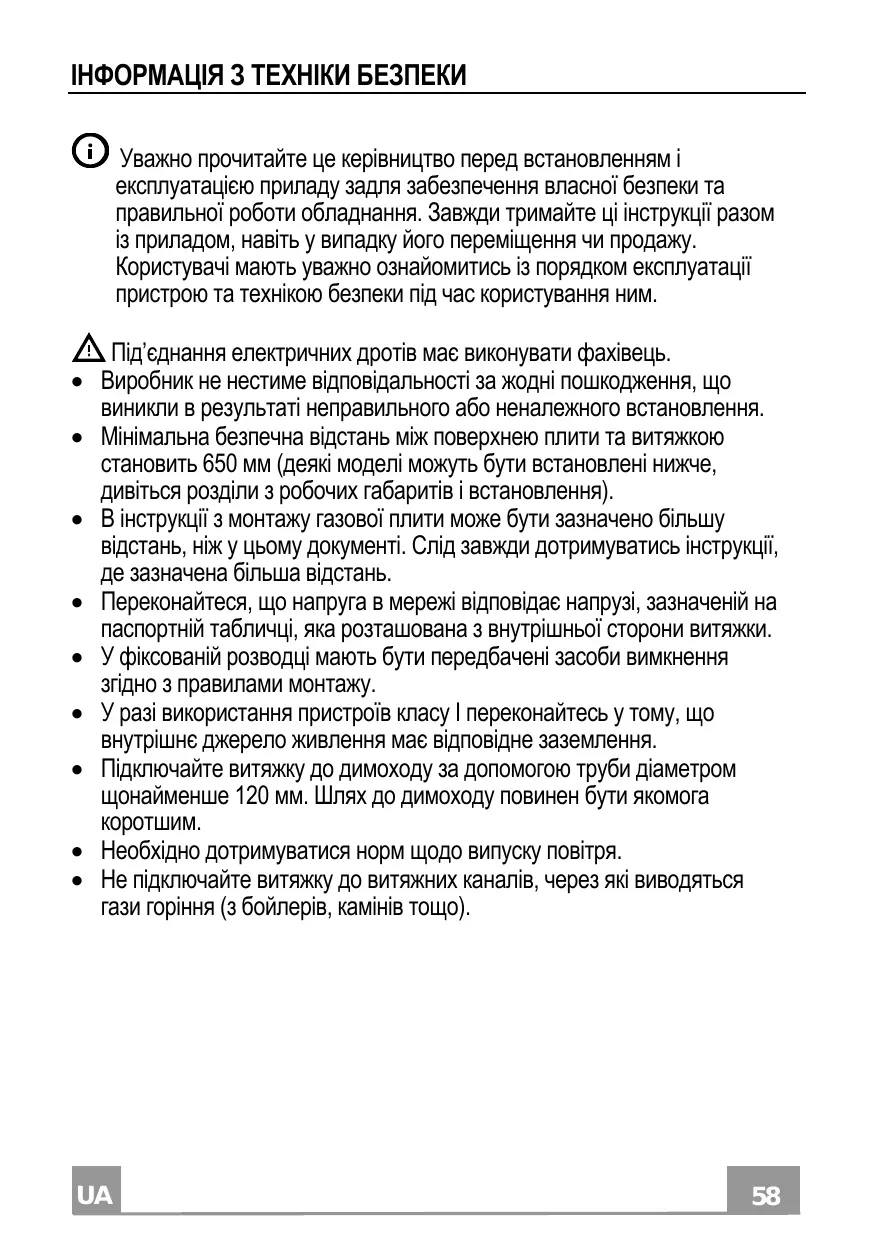 ІНФОРМАЦІЯ З ТЕХНІКИ БЕЗПЕКИ Уважно прочитайте це керівництво перед встановленням і експлуатацією приладу задля забезпечення власної безпеки та правильної роботи обладнання. Завжди тримайте ці інструкції разом із приладом, навіть у випадку його переміщення чи продажу. Користувачі мають уважно ознайомитись із порядком експлуатації пристрою та технікою безпеки під час користування ним. Під’єднання електричних дротів має виконувати фахівець. Виробник не нестиме відповідальності за жодні пошкодження, що виникли в результаті неправильного або неналежного встановлення. Мінімальна безпечна відстань між поверхнею плити та витяжкою становить 650 мм (деякі моделі можуть бути встановлені нижче, дивіться розділи з робочих габаритів і встановлення). В інструкції з монтажу газової плити може бути зазначено більшу відстань, ніж у цьому документі. Слід завжди дотримуватись інструкції, де зазначена більша відстань. Переконайтеся, що напруга в мережі відповідає напрузі, зазначеній на паспортній табличці, яка розташована з внутрішньої сторони витяжки. У фіксованій розводці мають бути передбачені засоби вимкнення згідно з правилами монтажу. У разі використання пристроїв класу I переконайтесь у тому, що внутрішнє джерело живлення має відповідне заземлення. Підключайте витяжку до димоходу за допомогою труби діаметром щонайменше 120 мм. Шлях до димоходу повинен бути якомога коротшим. Необхідно дотримуватися норм щодо випуску повітря. Не підключайте витяжку до витяжних каналів, через які виводяться гази горіння (з бойлерів, камінів тощо).