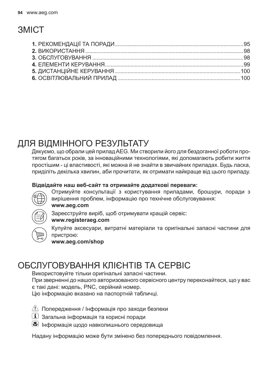 Дякуємо, що обрали цей прилад AEG. Ми створили його для бездоганної роботи протягом багатьох років, за інноваційними технологіями, які допомагають робити життя простішим - ці властивості, які можна й не знайти в звичайних приладах. Будь ласка, приділіть декілька хвилин, аби прочитати, як отримати найкраще від цього приладу. Відвідайте наш веб-сайт та отримайте додаткові переваги: Отримуйте консультації з користування приладами, брошури, поради з вирішення проблем, інформацію про технічне обслуговування: www.aeg.com Зареєструйте виріб, щоб отримувати кращій сервіс: www.registeraeg.com Купуйте аксесуари, витратні матеріали та оригінальні запасні частини для пристрою: www.aeg.com/shop