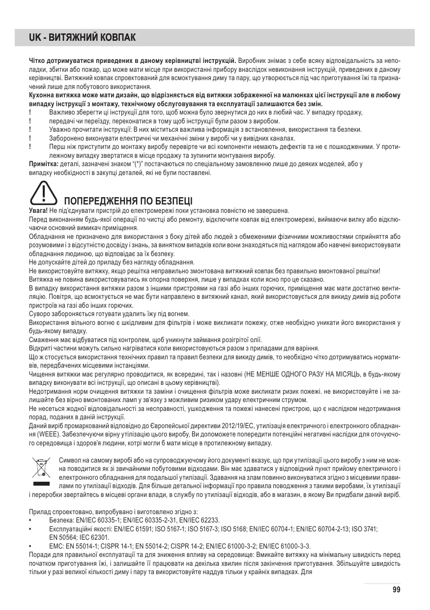 Les enfants doivent être surveillés afin qu’ils ne jouent pas avec l’appareil. Ne jamais utiliser la hotte sans que la grille ne soit montée correctement! La hotte ne doit JAMAIS être utilisée comme plan pour déposer quelque chose sauf si cela est expressément indiqué. Quand la hotte est utilisée en même temps que d’autres appareils à combustion de gaz ou d’autres combustibles, le local doit disposer d’une ventilation suffisante. L’air aspiré ne doit jamais être envoyé dans un conduit utilisé pour l’évacuation des fumées produites par des appareils à combustion de gaz ou d’autres combustibles. Il est formellement interdit de faire flamber les aliments sous la hotte. L’utilisation de flammes libres peut entraîner des dégâts aux filtres et peut donner lieu à des incendies, il faut donc les éviter à tout prix. La friture d’aliments doit être réalisée sous contrôle pour éviter que l’huile surchauffée ne prenne feu. Les pièces accessibles peuvent se réchauffer de façon importante quand elles sont utilisées avec des appareils pour la cuisson. En ce qui concerne les mesures techniques et de sécurité à adopter pour l’évacuation des fumées, s’en tenir strictement à ce qui est prévu dans les règlements des autorités locales compétentes. La hotte doit être régulièrement nettoyée, aussi bien à l’intérieur qu’à l’extérieur (AU MOINS UNE FOIS PAR MOIS, respecter néanmoins les instructions relatives à l’entretien fournies dans ce manuel). La non observation de ces normes de nettoyage de la hotte et du changement et nettoyage des filtres comporte des risques d’incendie. Ne pas utiliser ou laisser la hotte sans que les ampoules soient correctement placées pour éviter tout risque de choc électrique. La société décline toute responsabilité pour d’éventuels inconvénients, dégâts ou incendies provoqués par l’appareil et dérivés de la non observation des instructions reprises dans ce manuel. Cet appareil porte le symbole du recyclage conformément à la Directive Européenne 2012/19/CE concernant les Déchets d’Équipements Électriques et Électroniques (DEEE ou WEEE). En procédant correctement à la mise au rebut de cet appareil, vous contribuerez à empêcher toute conséquence nuisible pour l’environnement et la santé de l’homme. Le symbole présent sur l’appareil ou sur la documentation qui l’accompagne indique que ce produit ne peut en aucun cas être traité comme déchet ménager. Il doit par conséquent être remis à un centre de collecte des déchets chargé du recyclage des équipements électriques et électroniques. Pour la mise au rebut, respectez les normes relatives à l’élimination des déchets en vigueur dans le pays d’installation. Pour obtenir de plus amples détails au sujet du traitement, de la récupération et du recyclage de cet appareil, veuillez vous adresser au bureau compétent de votre commune, à la société de collecte des déchets ou directement à votre revendeur.