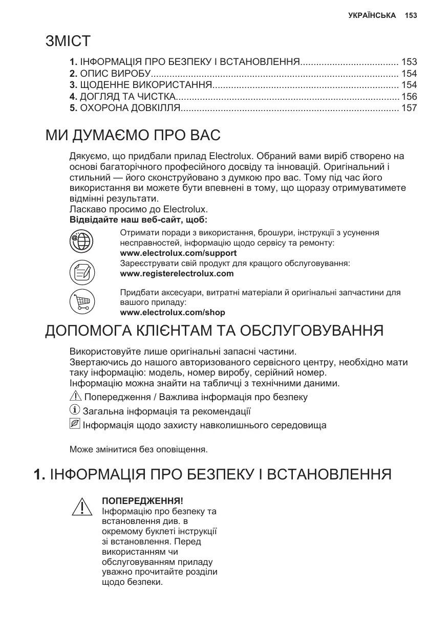 ЗМІСТ 1. ІНФОРМАЦІЯ ПРО БЕЗПЕКУ І ВСТАНОВЛЕННЯ 153 2. ОПИС ВИРОБУ 154 3. ЩОДЕННЕ ВИКОРИСТАННЯ 154 4. ДОГЛЯД ТА ЧИСТКА 156 5. ОХОРОНА ДОВКІЛЛЯ 157